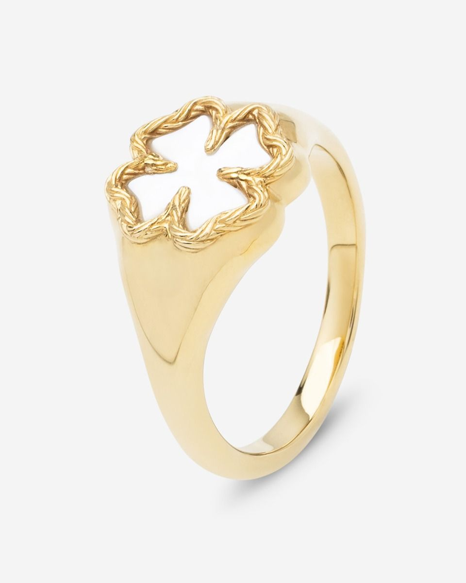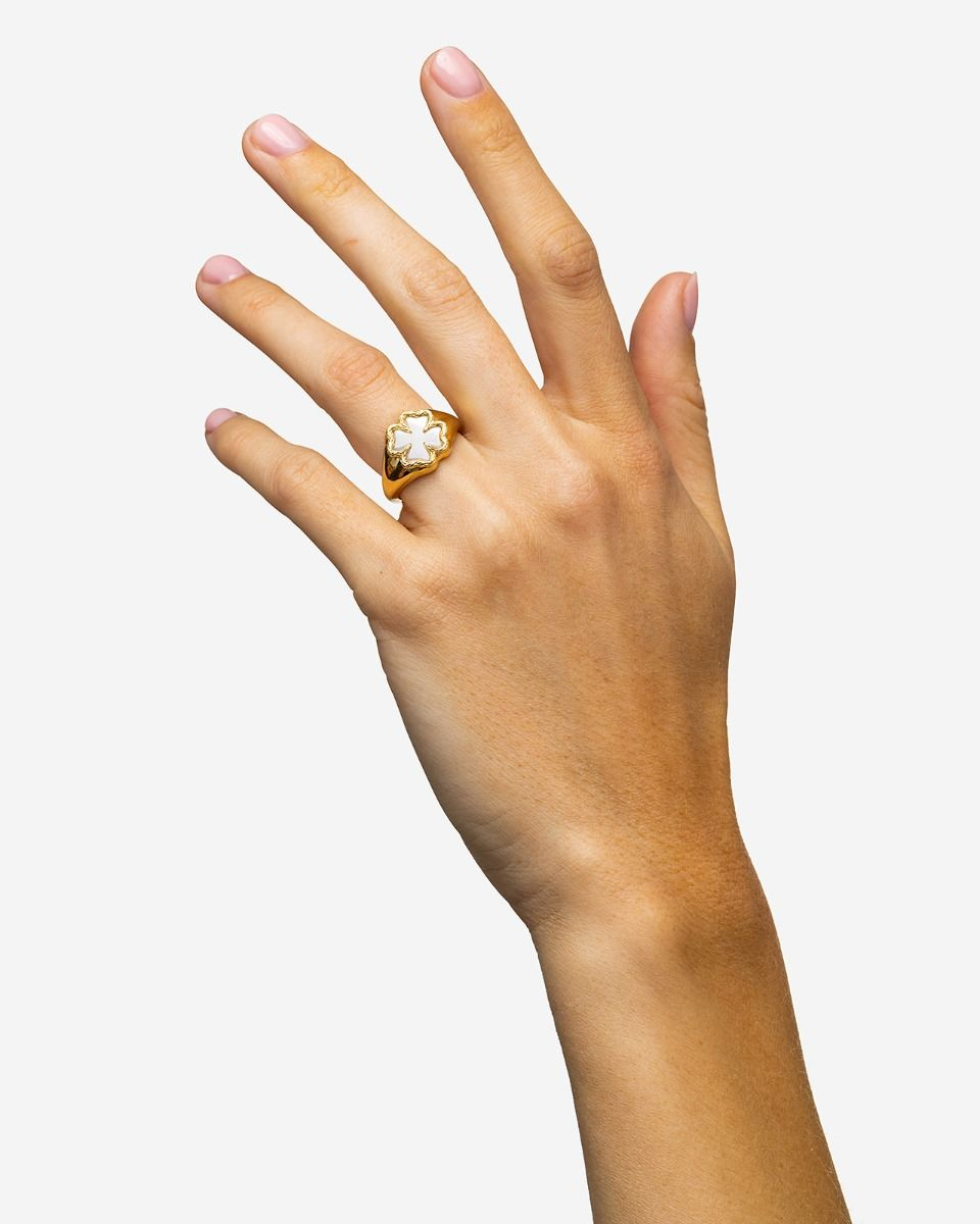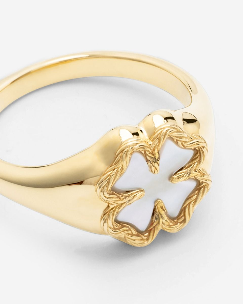 Vier jouw geluk met de Vergulde Katja Klaver Zegelring. Deze Zegelring is met gedetailleerde klaverblaadjes de nieuwste toevoeging aan onze Katja Klaver collectie en heeft een inleg van parelmoer, wat de ring een unieke look geeft. Ontworpen in Amsterdam en handgemaakt in Zuid-Oost Azië van gerecycled zilver met een premium gold plating (3.0 micron dik). De plating is gemiddeld 5 maal dikker dan reguliere gold plated items. Vermijd contact met parfum, schoonmaakmiddelen en water om je gold plated sieraad zo lang mogelijk mooi te houden. Vier zelf het geluk van het leven met Katja Klaver Zegelring of geef het geluk cadeau aan een dierbare.