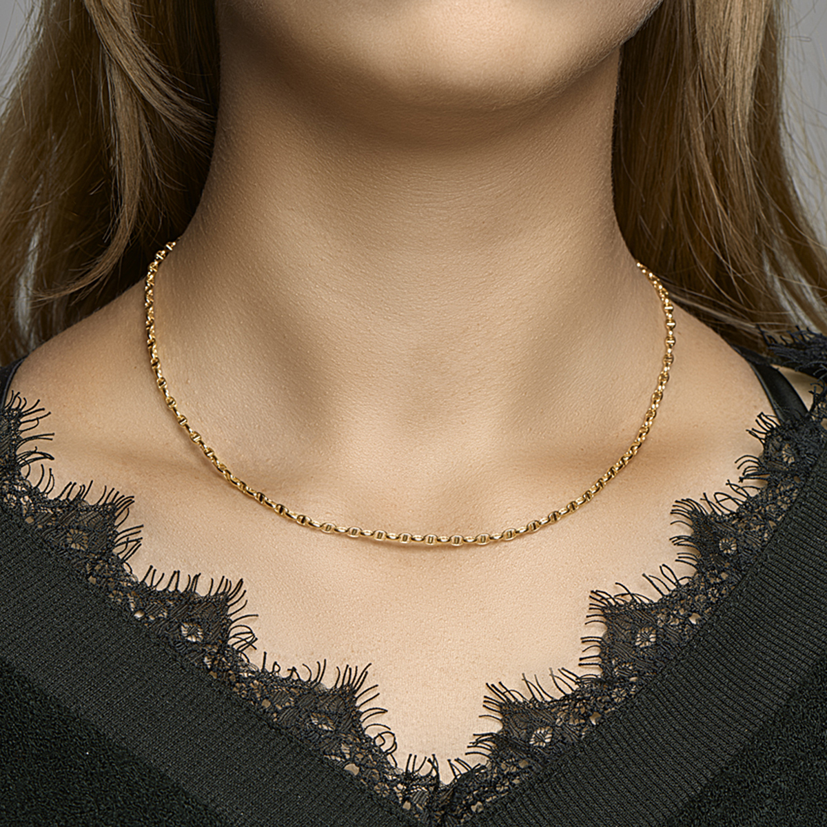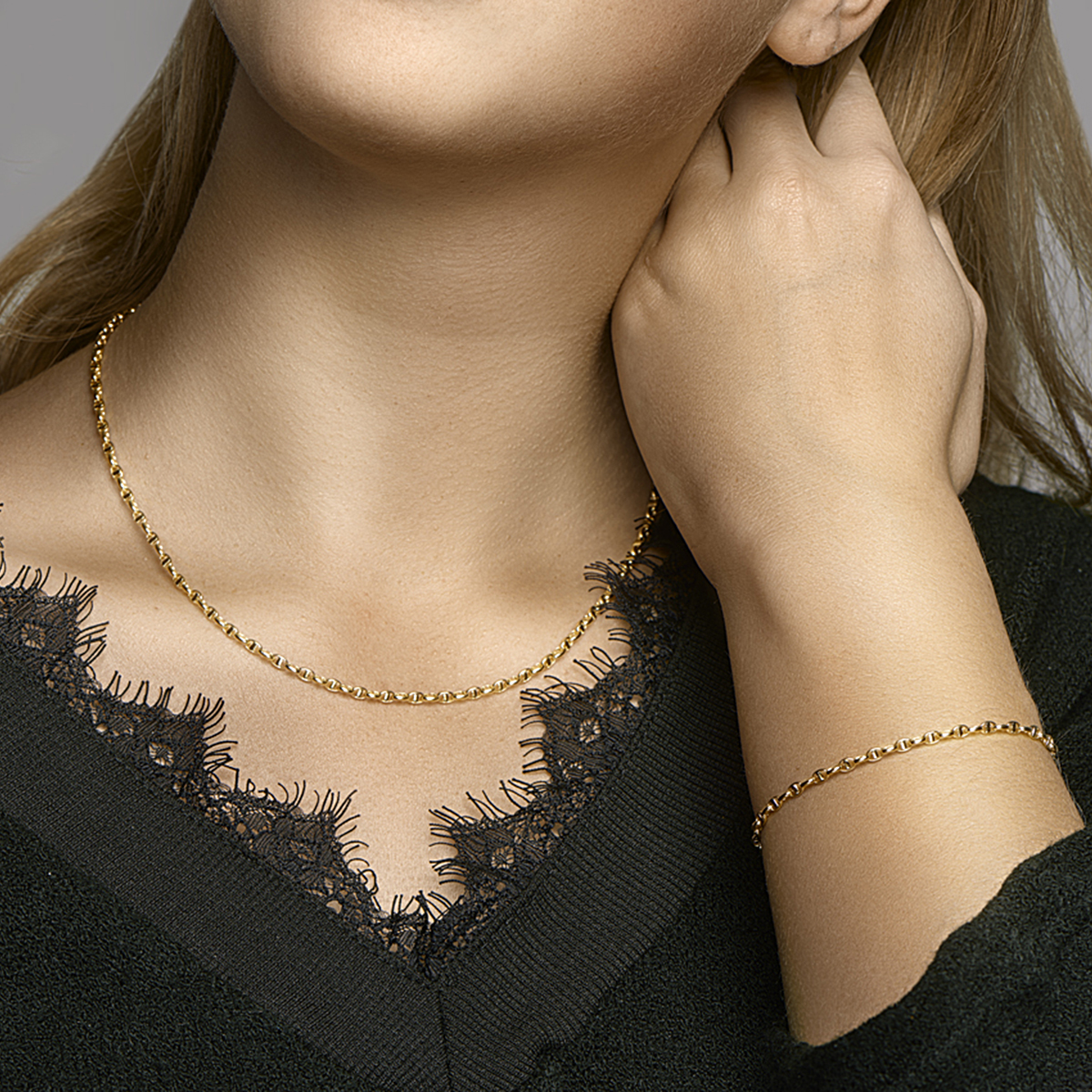Geelgouden collier met een lengte van 50cm en 2.9mm breed en met een karabijn sluiting. Het collier is te combineren met bijpassende armband uit onze collectie.