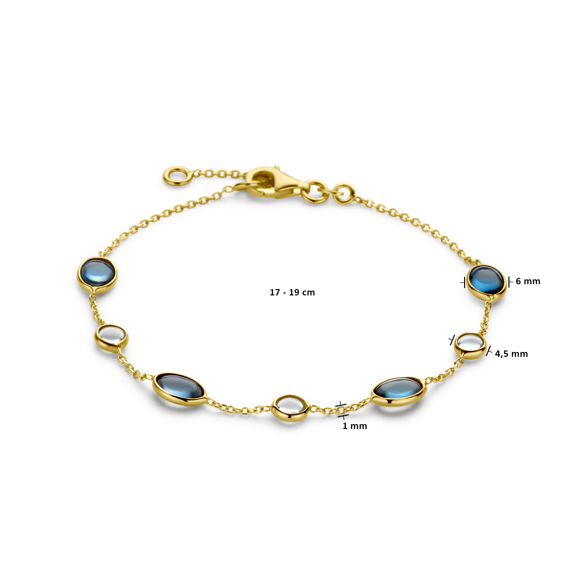 14k Geelgouden armband uitgevoerd met met london blue en blauw topaas. De armband heeft een schakelbreedte van 1mm en draaglengtes van 17-19cm. Uitgevoerd met karabijn sluiting.