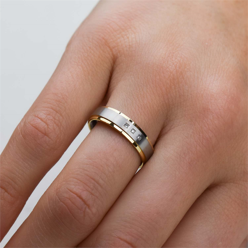 Deze gematteerde bicolor ring van Boccia Titanium heeft glanzende en goudkleurige accenten en drie diamanten. De met de hand gezette diamanten in dit sieraad zorgen voor een sprankelend effect. De ring is 5mm breed.