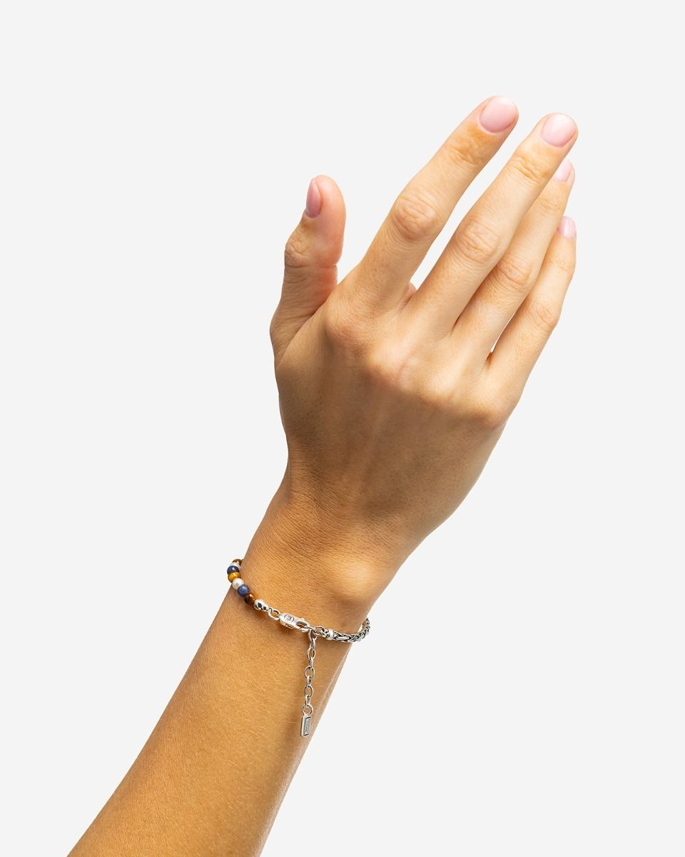 Laat je betoveren door onze nieuwe Spirit Bead Stacking Armbanden! De Spirit Bead Stacking Armband Zilver Tiger Eye Sodalite wordt gekenmerkt door 4mm Gemstone Spirit Beads en een elegante compositie van verfijnde zoetwaterparels, 925 sterling zilveren George Beads en het kenmerkende George Mini-vlechtwerk. Specifiek ontworpen met kleinere Gemstone Beads en subtiel verstelbaar dankzij de hoogwaardige karabijnsluiting, voor een perfecte, unisex pasvorm bij elke pols. De armband is geïnspireerd door Balinese bidkralen en heeft helende werkingen. Zo bevordert Tiger Eye innerlijke kracht en zelfvertrouwen, helpt het bij het nemen van beslissingen en biedt het bescherming tegen negatieve invloeden. Sodalite staat bekend om zijn kalmerende energie, versterkt het zelfinzicht en bevordert harmonie tussen gevoel en verstand. Edelstenen zoals Tiger Eye en Sodalite zijn natuurproducten en kunnen gevoelig zijn voor harde stoten, water en chemische middelen. Vermijd contact met parfum, schoonmaakmiddelen of langdurige blootstelling aan zonlicht om de kleur en glans te behouden. Wie ga jij verrassen met deze Spirit Bead Stacking Armband?