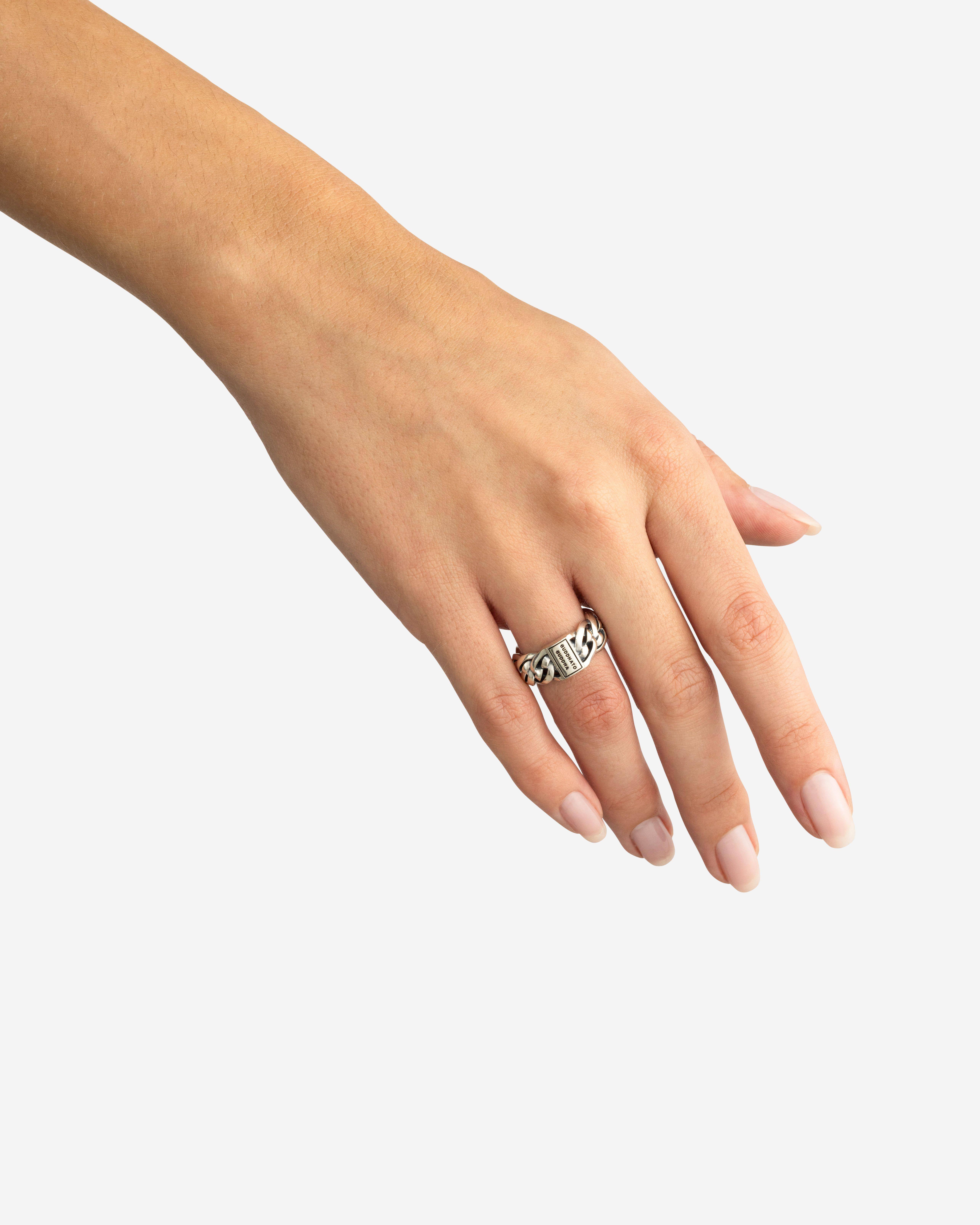 De Nathalie Small ring is een unieke creatie die gebasseerd is op de Nathalie schakel. Met zijn dubbele schakel is deze gerecycled zilveren ring een waar icoon in de collectie. Creëer een krachtige en onderscheidende look met deze tijdloze en met de hand vervaardigde ring, waar vakmanschap in elk detail tot uiting komt. Deze Nathalie Small Ring is subtieler dan de Nathalie ring en behoort tot de categorie smalle ringen. Ontworpen in Amsterdam en met toewijding geproduceerd in Zuidoost-Azië. Ben jij klaar voor een nieuw hoofdstuk met deze ring?