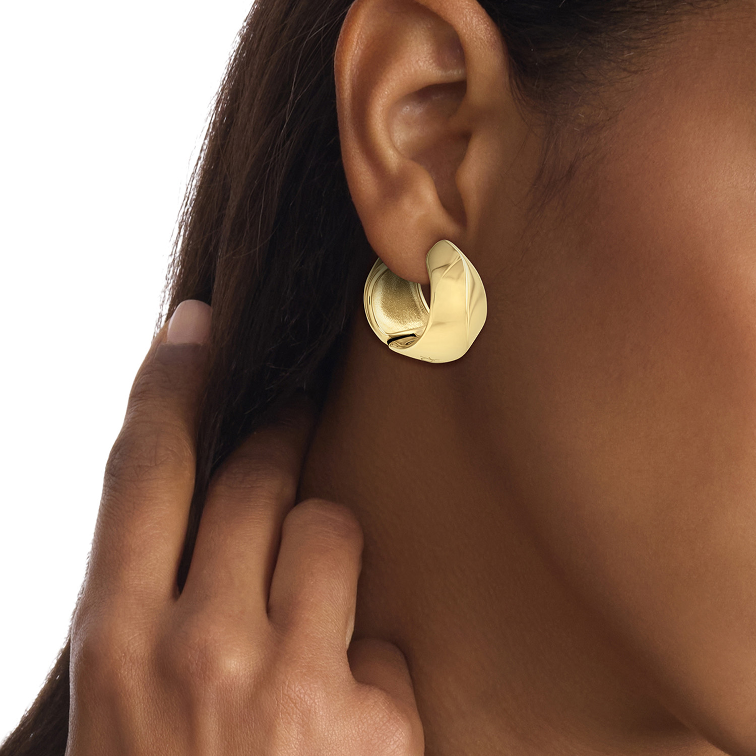 Deze stalen dames oorsieraden van Calvin Klein met nr CJ35000820 hebben een sierlijk uiterlijk. De goudkleurige oorringen hebben een sculpturale vorm en sluiten met een scharnier mooi aan op het oor. Het zijn echte blikvangers. Leuk te combineren met andere sieraden uit de serie van Calvin Klein.
