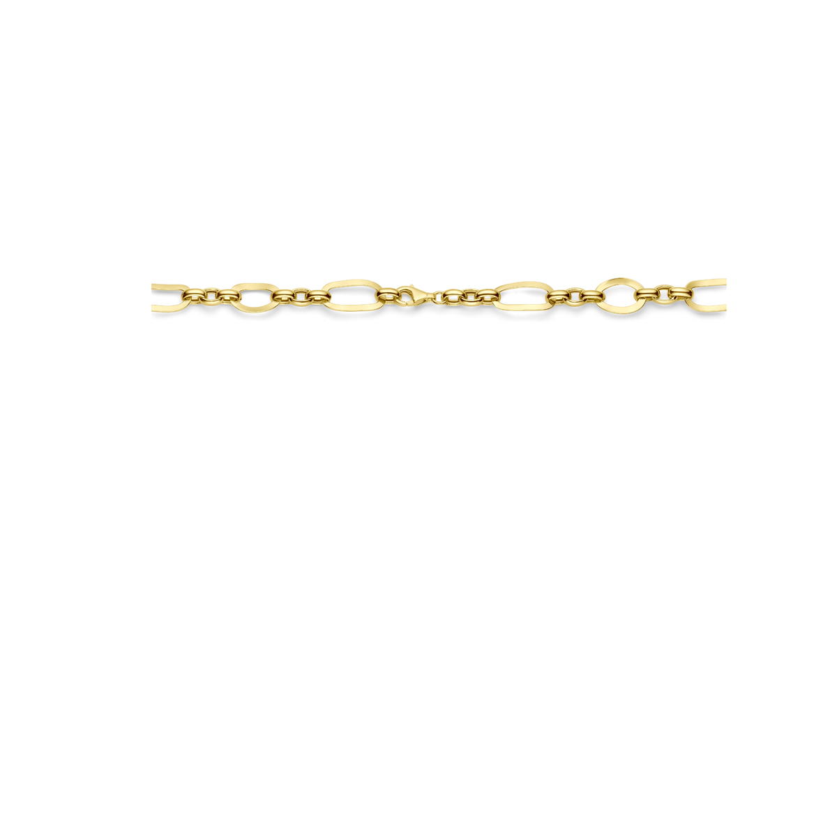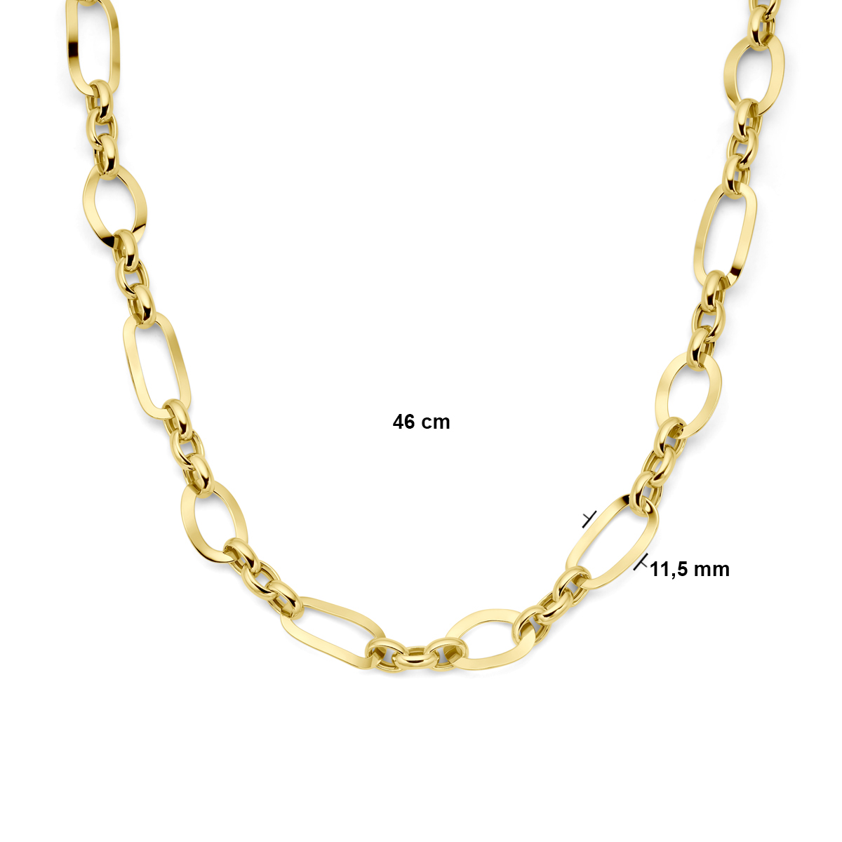 Geelgoud op 925 zilveren anker collier. Het collier heeft een draaglengte van 46cm. De schakelbreedte is 11.5mm. Uitgevoerd met een karabijn sluiting. Geen garantie op de plating.
