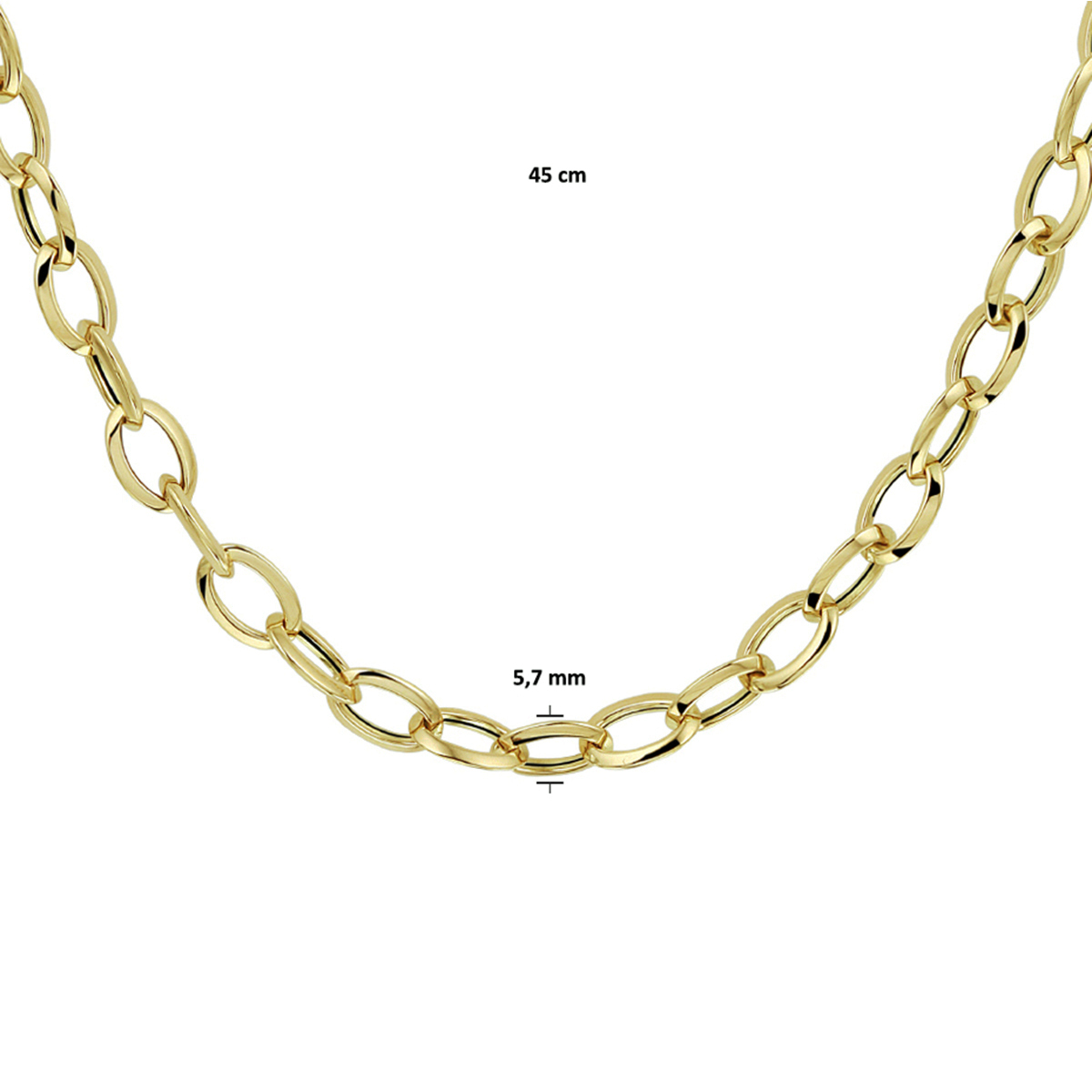 Geelgouden anker collier met een draaglengte van 45cm en een schakelbreedte van 5.7mm. Het collier heeft een poli afwerking en is uitgevoerd met een stevige karabijn sluiting.