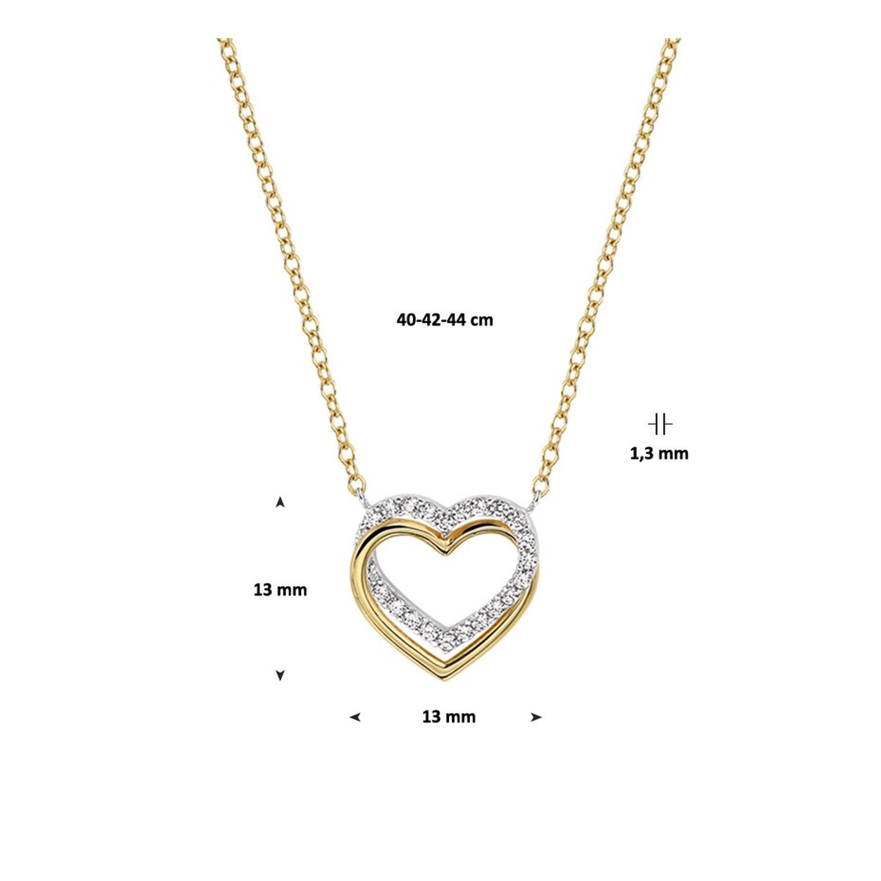 Geelgouden collier met harten en zirkonia. Het collier heeft draaglengtes van 40 42 en 44 cm.