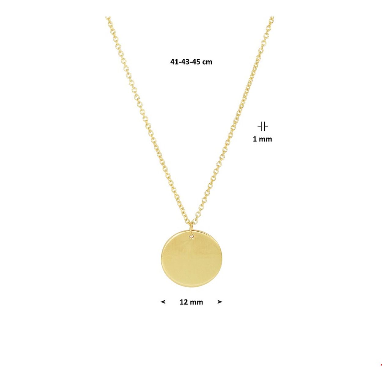 Trendy 14k geelgouden 1mm anker collier met draaglengtes van 41 43 en 45cm. Uitgevoerd met een poli afgewerkt rondje van 12mm en een stevige karabijn sluiting. Door het simplistische design gemakkelijk te combineren met andere gouden rondjes sieraden.