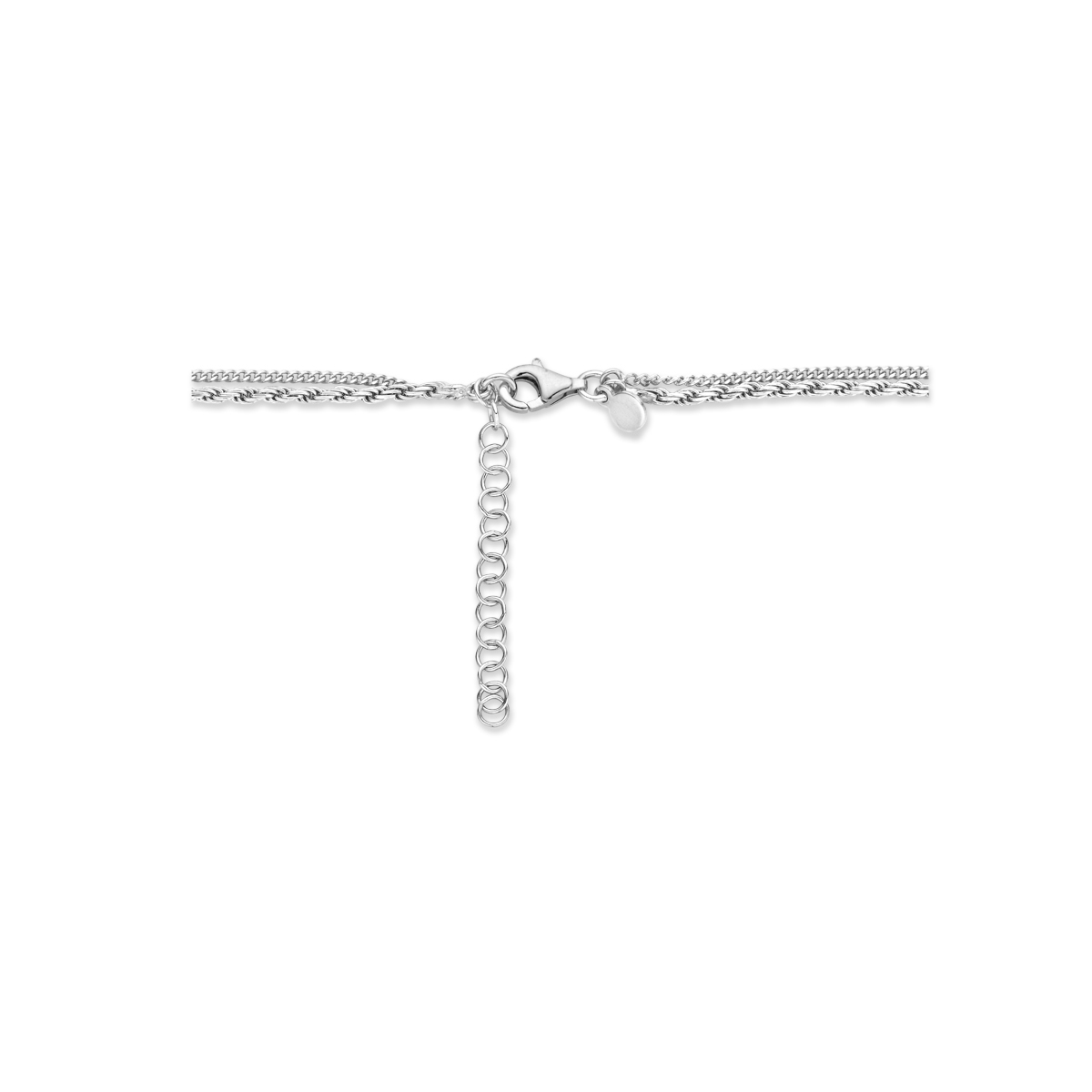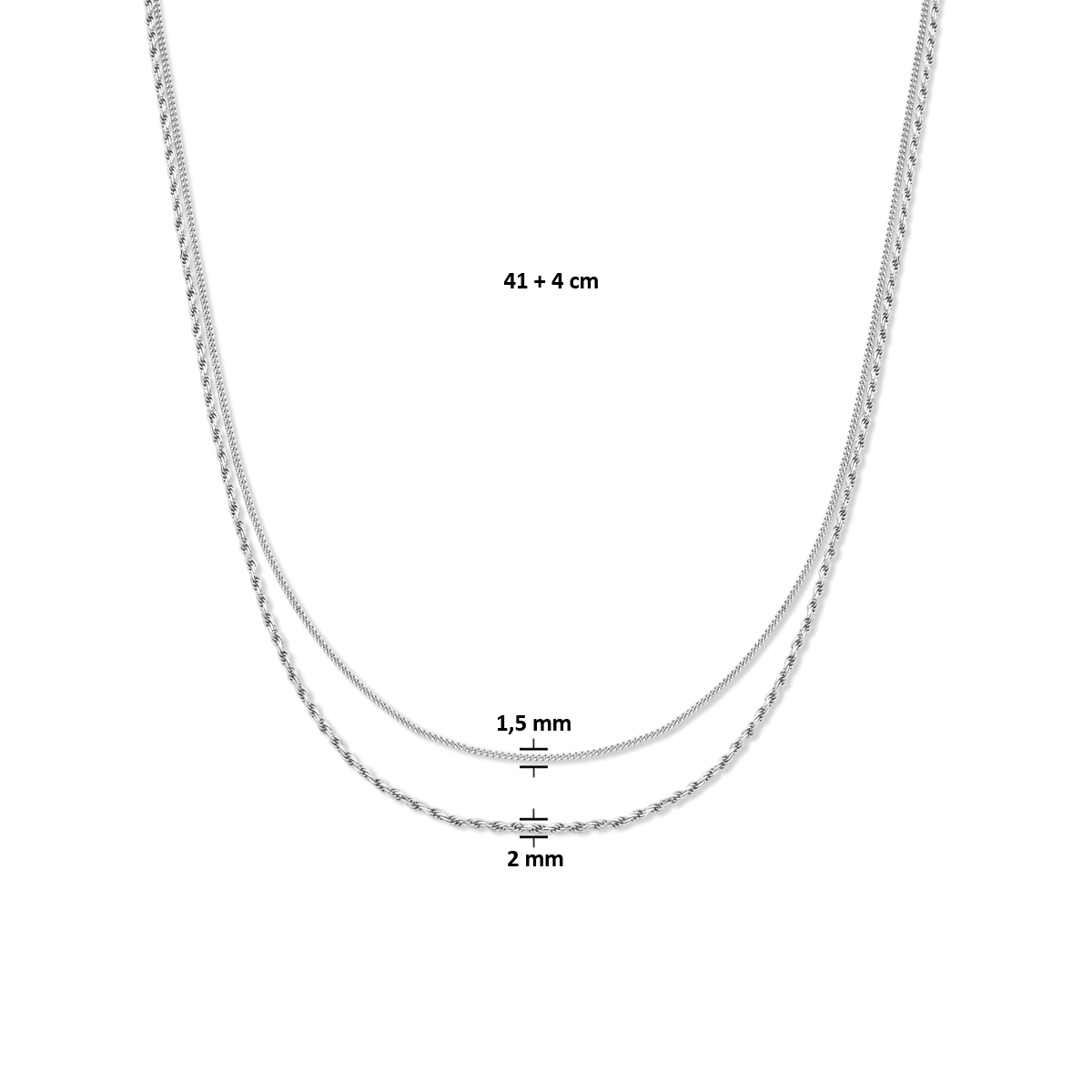 Gerhodineerd 925 zilveren collier met schakelbreedtes van 1.5 en 2mm. Het collier heeft een draaglengte van 41cm en een extensie van 4cm. Uitgevoerd met een karabijn sluiting.