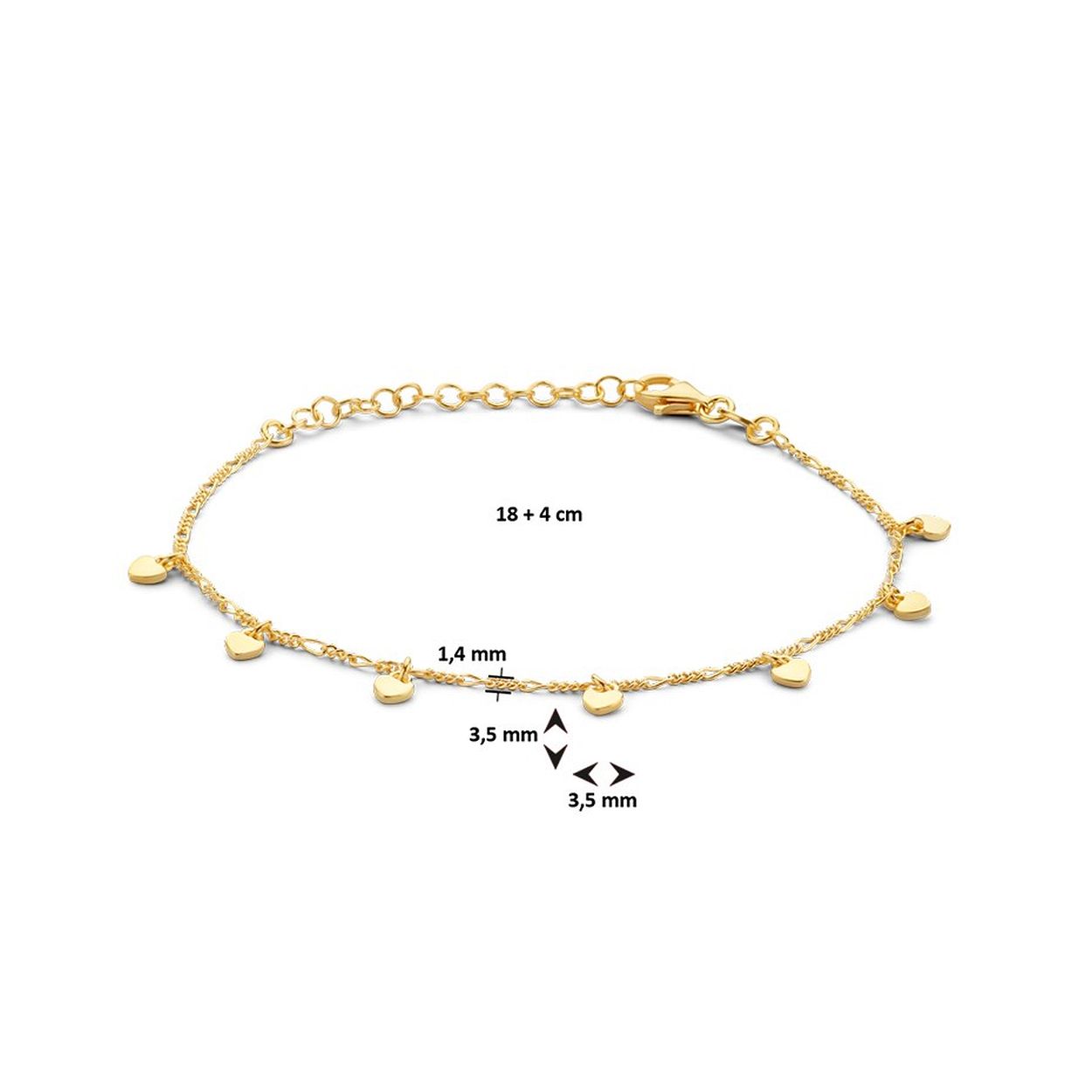 Geelgoud op 925 zilveren enkelbandje uitgevoerd met hartjes. Het enkelbandje heeft een draaglengte van 18cm met een extensie van 4cm en een stevige karabijn sluiting.