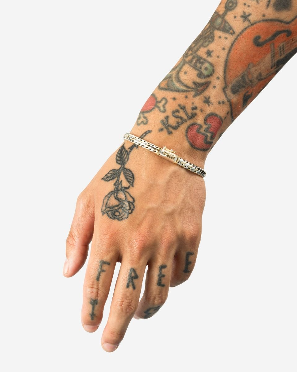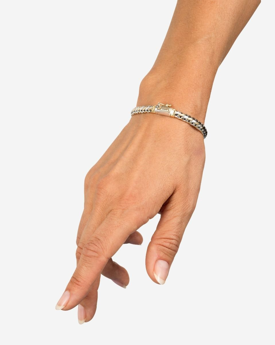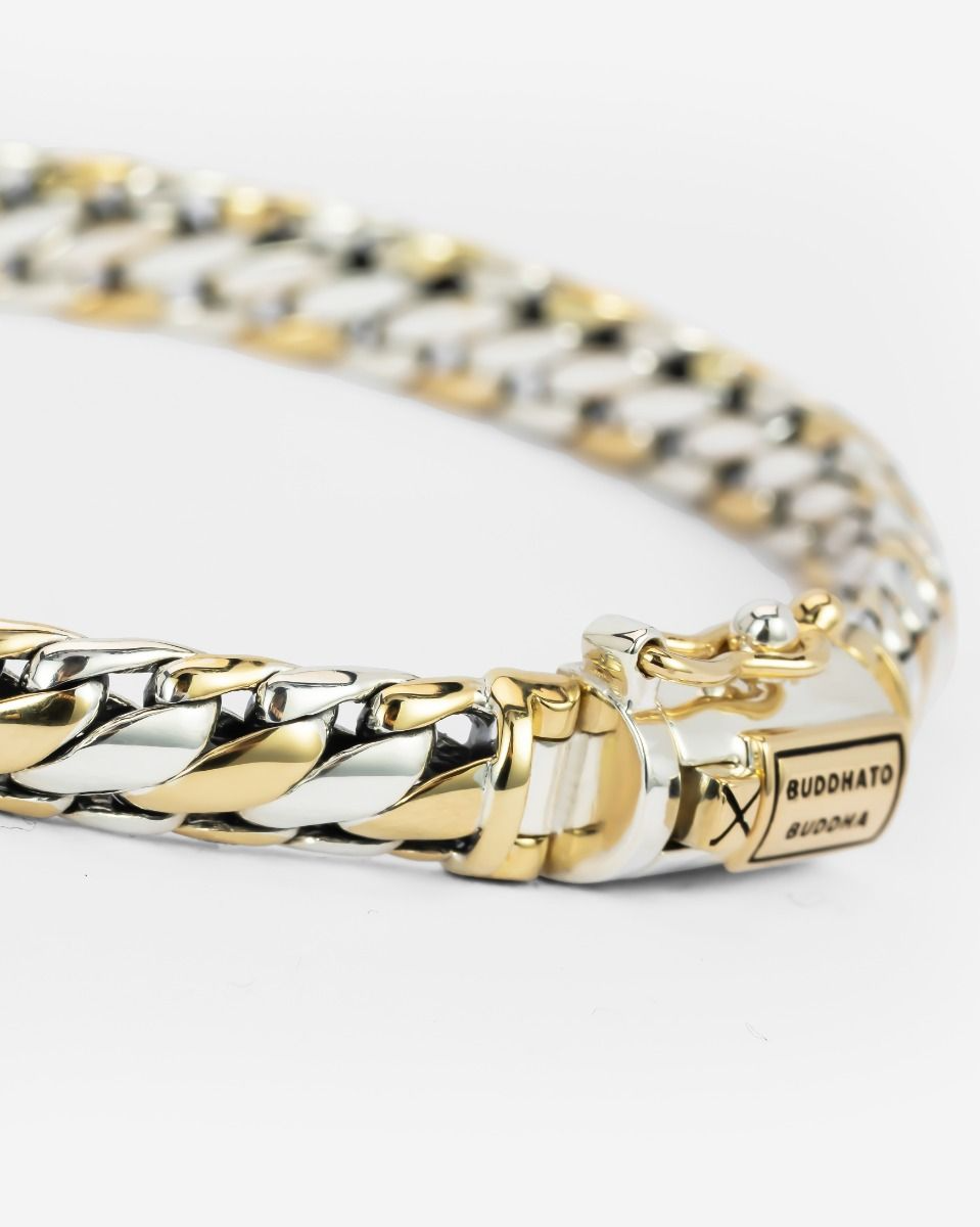 De Ben-collectie is een van de meest geliefde collecties van Buddha to Buddha. Het luxe assortiment wordt verrijkt met deze opmerkelijke variant met een mix van 14-karaats geelgoud en 925 sterling zilver. De Ben Mini Armband in Bicolor is verfijnd met een krachtige uitstraling en heeft dezelfde strakke vorm als de Ben Gouden Armband. Elk stuk is met de hand gemaakt en heeft de tijdloze kenmerken die typerend zijn voor Buddha to Buddha-sieraden. De Ben Mini Armband in Bicolor is ontworpen in Amsterdam en ethisch verkregen uit 100% gerecycled zilver en goud in Zuidoost-Azië.