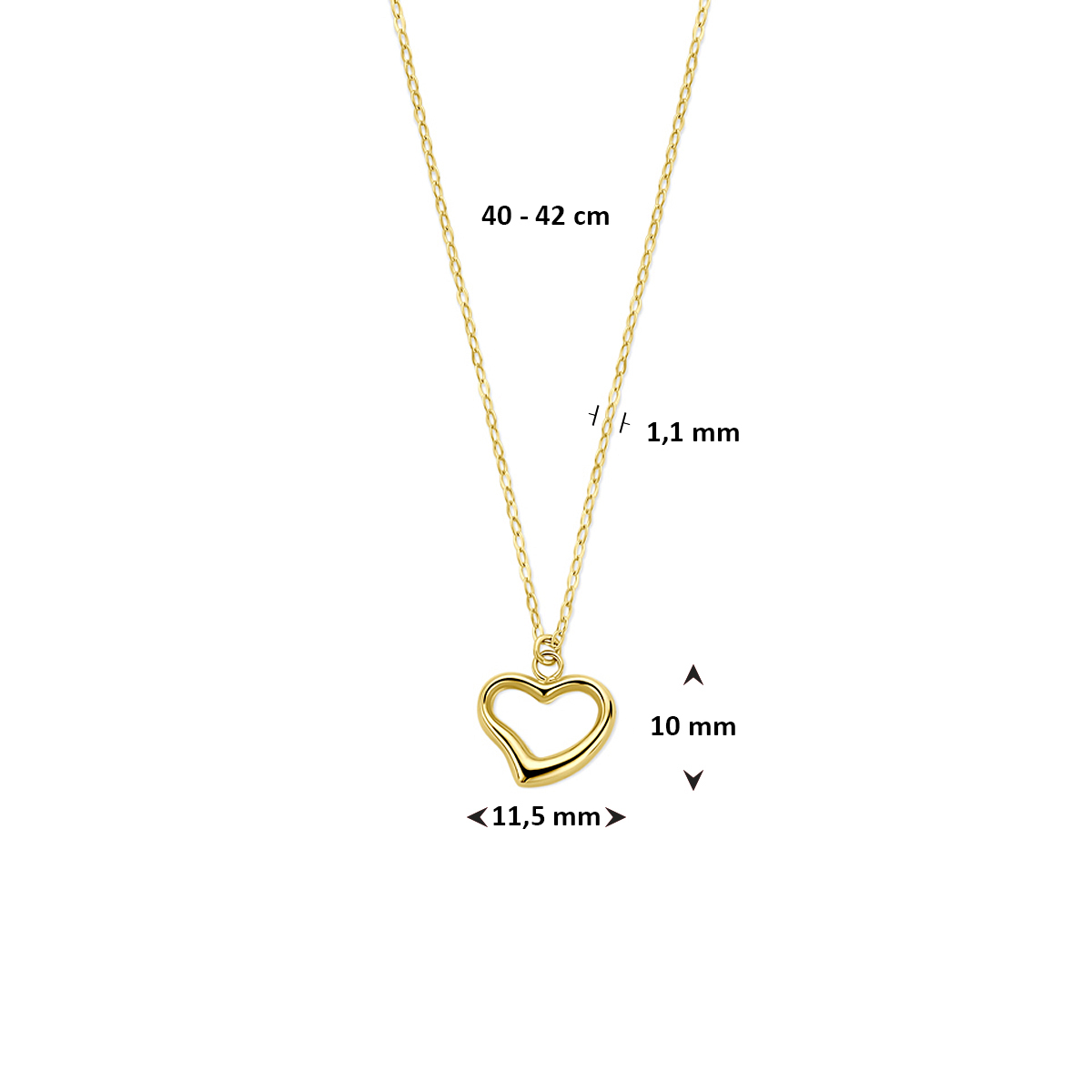 14k Geelgouden collier uitgevoerd met een hartje. Het collier heeft draaglengtes van 40-42cm en een schakelbreedte van 1.1mm.