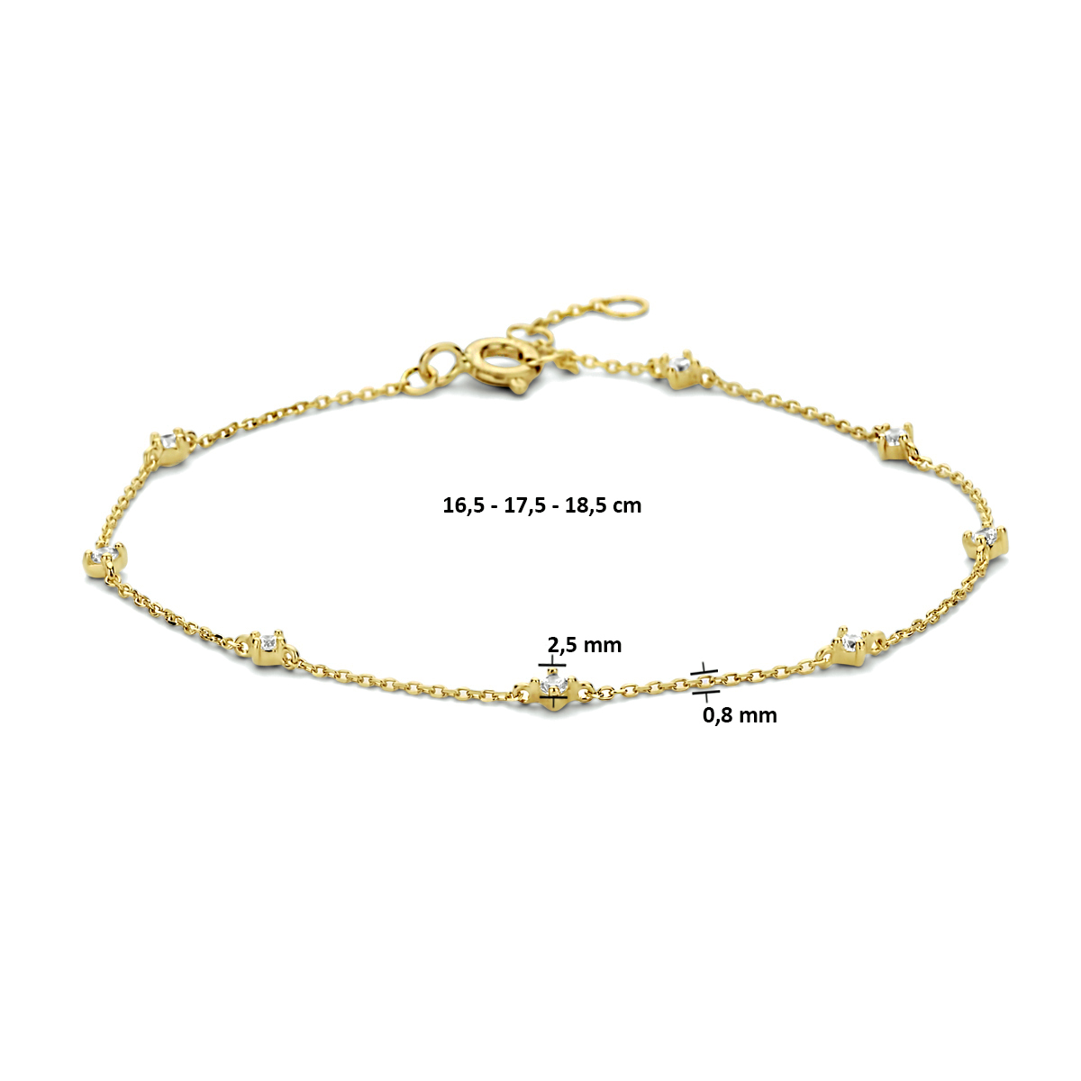 14k Geelgouden armband uitgevoerd met zirkonia. De armband heeft een breedte van 2.5mm en draaglengtes van 16.5, 17.5 en 18.5cm. De schakelbreedte is 0.8mm.