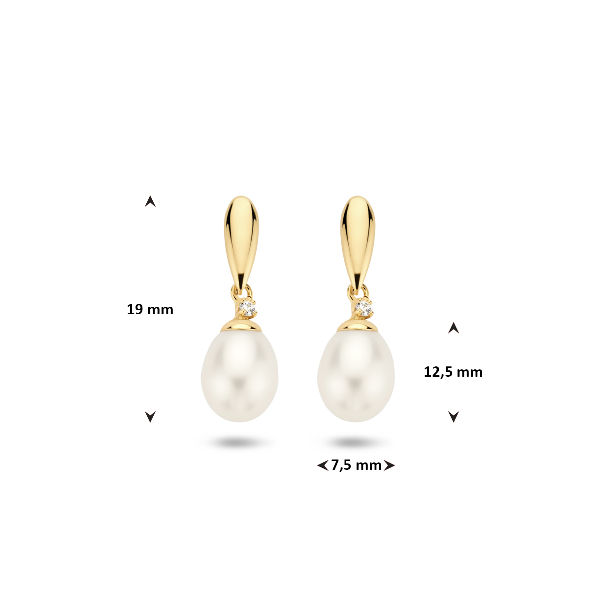 Geelgouden oorhangers met een zoetwaterparel en zirkonia. De oorhangers zijn onderdeel van een set.