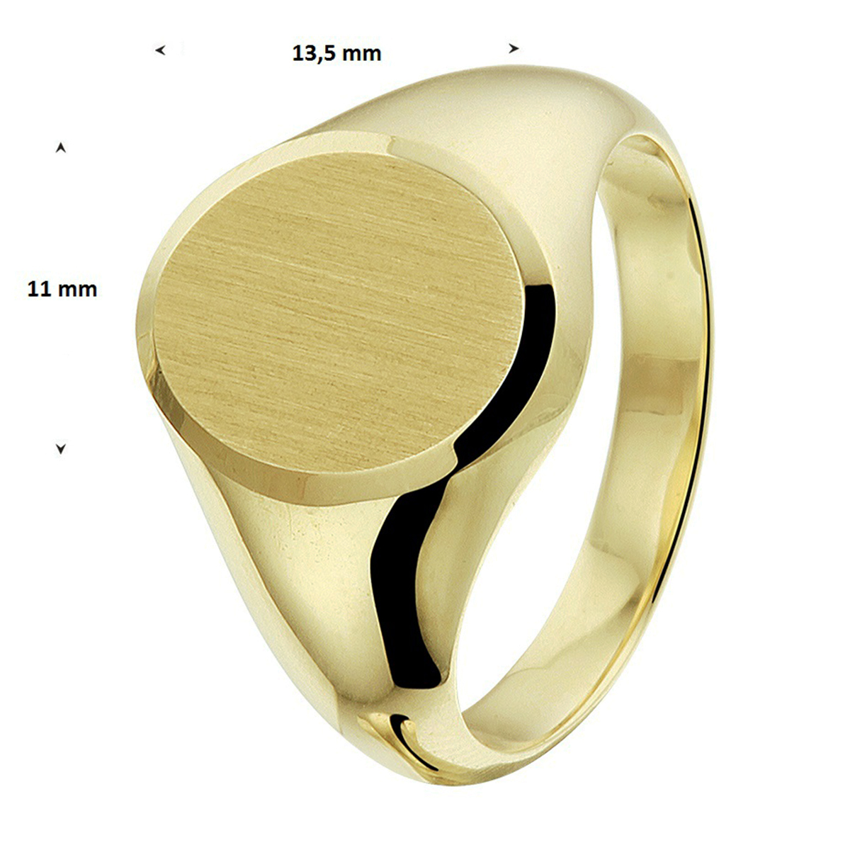 Stijlvolle geelgouden massieve graveerring met een afmeting van 13.5x11mm. De gediamanteerde afwerking en de robuuste afkanting maken de ring helemaal af.