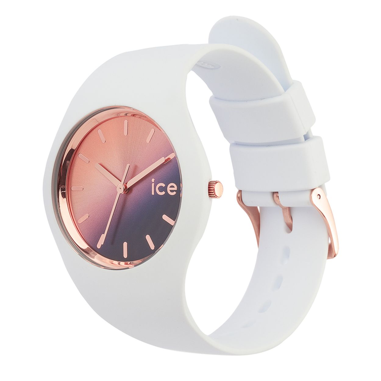 Ice Watch Sunset - IW015749   Dit dames horloge van Ice-Watch uit de Sunset serie heeft een witte silicone band en een roze wijzerplaat met ros�goudkleurige details en een streepjes aanduiding. Het horloge heeft mineraal glas en een kastdiameter van 40 mm.    HET MERK  Ice-Watch bestaat al sinds 2007 en heeft als motto "Change. You can". De horloges worden in verschillende kleuren - van transparant tot fluorescerend - uitgevoerd. Dit zorgt ervoor dat er een Ice-Watch is voor elke smaak, stijl en elke look waardoor je zo vaak van Ice-Watch kunt wisselen zoals je wilt.    SPECIFICATIES  - Mineraal glas  - Ronde kastvorm � 40 mm  - Witte horlogekast  - Roze wijzerplaat  - Witte silicone horlogeband  - 10 ATM (Zwemmen en snorkelen)