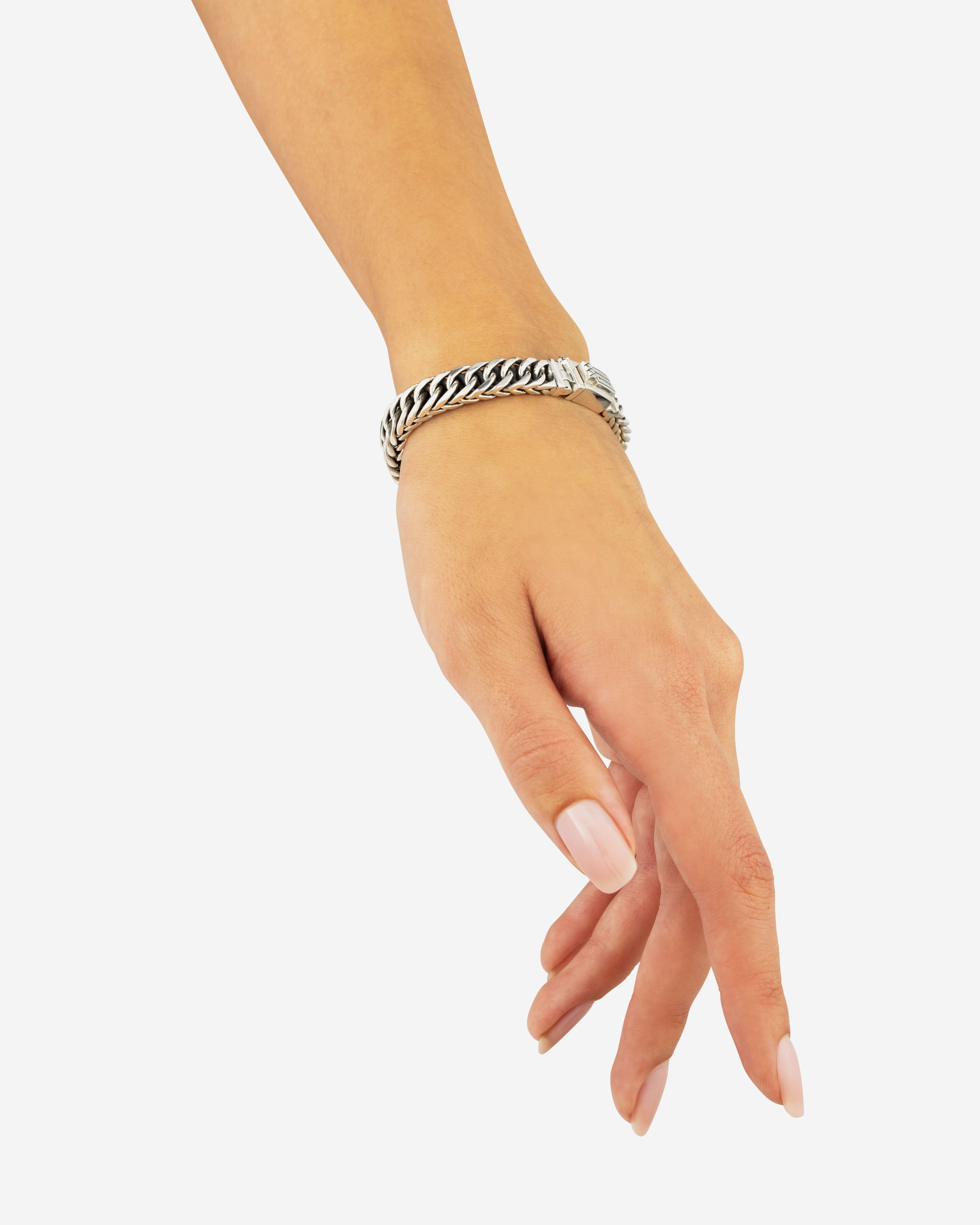 De Esther XS armband is een van de bekendste armbanden van onze iconische sieraden collectiel. De stoere gevlochten schakel maakt deze sterling zilveren armband tot een echte must have! De schakels zijn geoxideerd waardoor de binnenkant van de schakel donker is. Ontworpen in Amsterdam en met precisie handgemaakt uit gerecycled zilver in Zuid-Oost Azië. De Esther XS is niet zomaar een sieraad; het is een stukje kunst dat je draagt als symbool van jouw unieke pad.