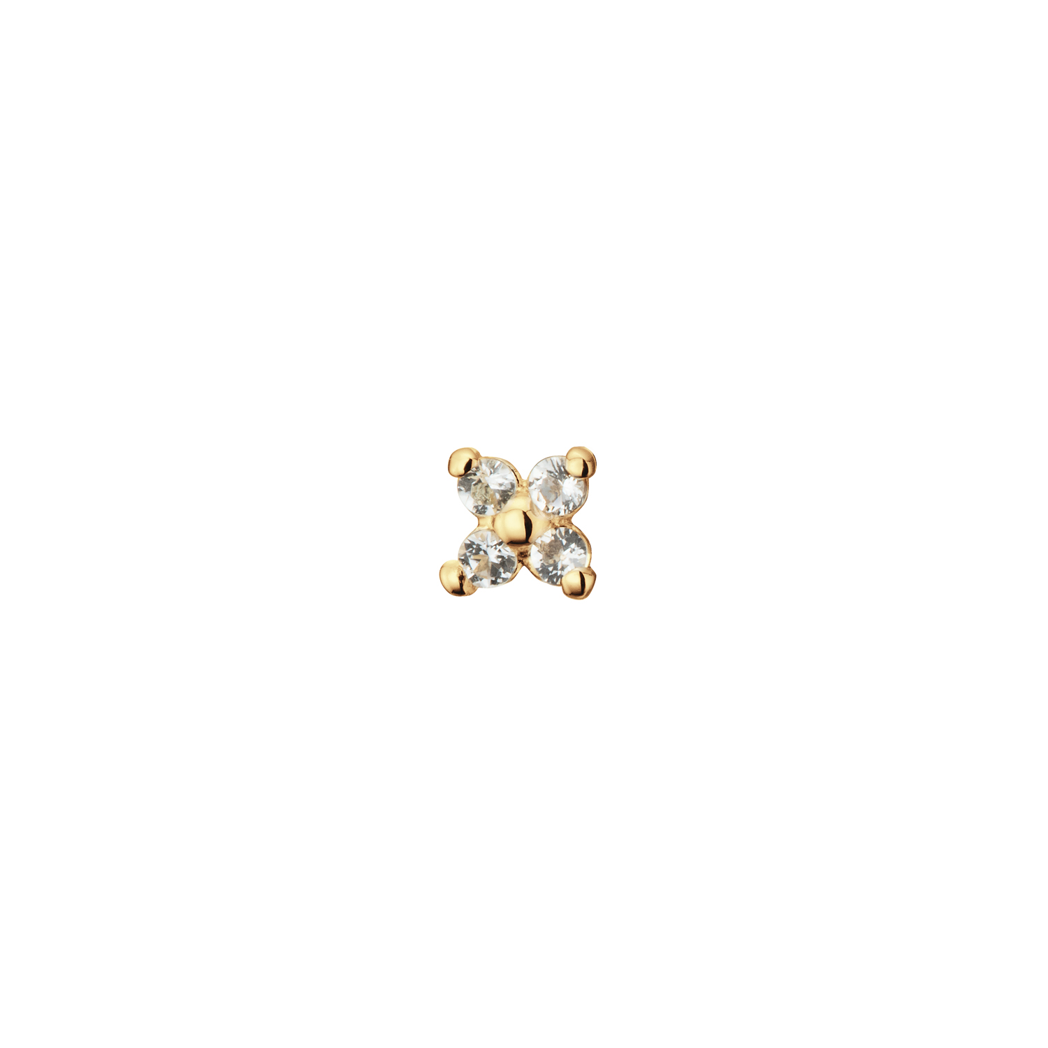 De 14 karaat gouden Bloom White Topaz piercing met 2 schroefstaafjes en een bloemetje als achterkant, maken het in- en uitdoen heel makkelijk! Je kunt ze ook inhouden als je gaat slapen. Voeg als finishing touch een piercing toe aan je Jackie earparty!
