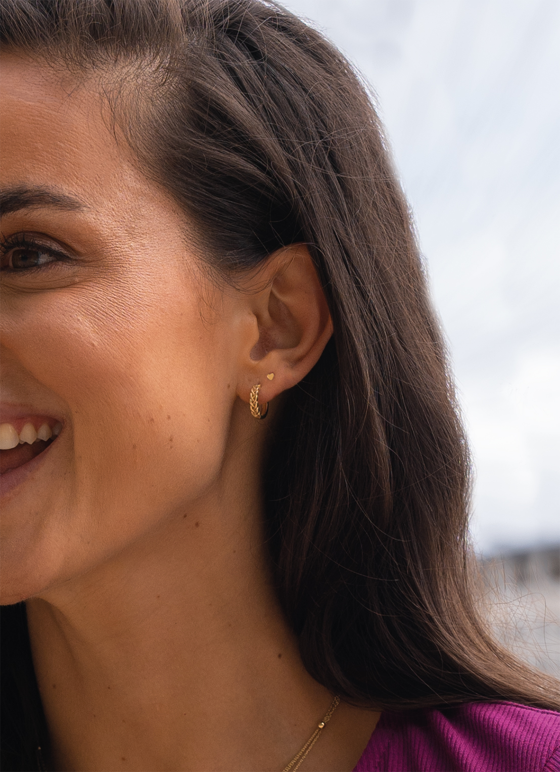 Verbintenis alom met deze 14K gouden Petit Sablon gevlochten klapoorringen met een doorsnee van 7mm. Een verfijnde ronde oorring die perfect aan het oor sluit. Goed te combineren met de andere sieraden van Jackie voor een trendy look!