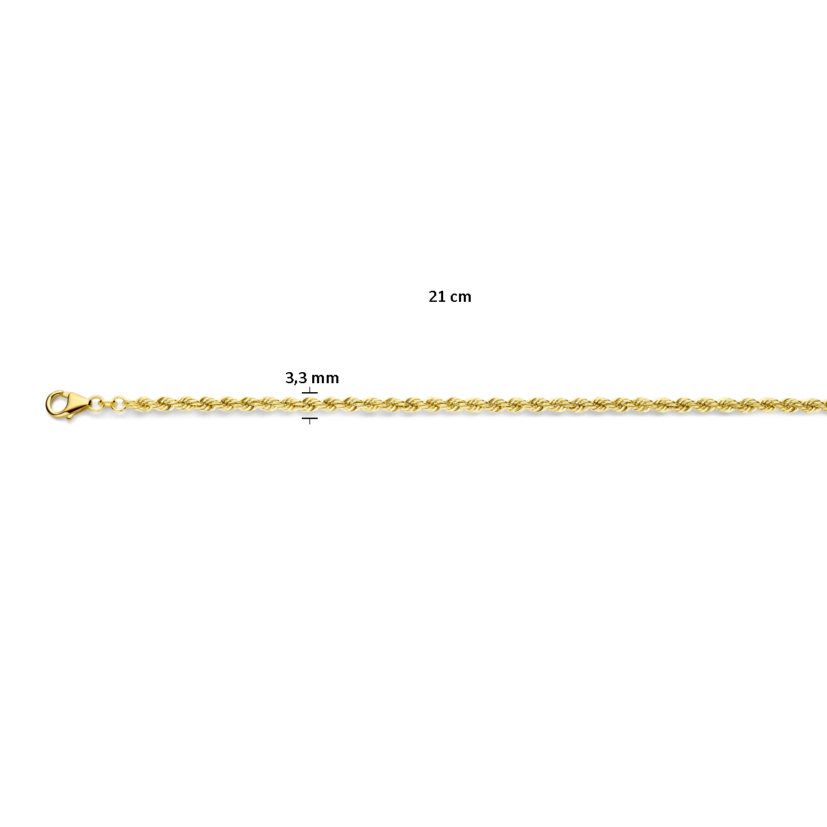 14k Geelgouden koord lengte-artikel uitgevoerd met een karabijn sluiting. De schakelbreedte is 3.3mm.