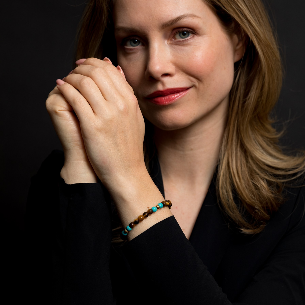 Armband van het merk Rebel & Rose. De armband heeft een hoogwaardige elastische stretch koord, met 6mm van Tijgeroog geel bruin, Art. Turquoise, RVS ion-gold plated.