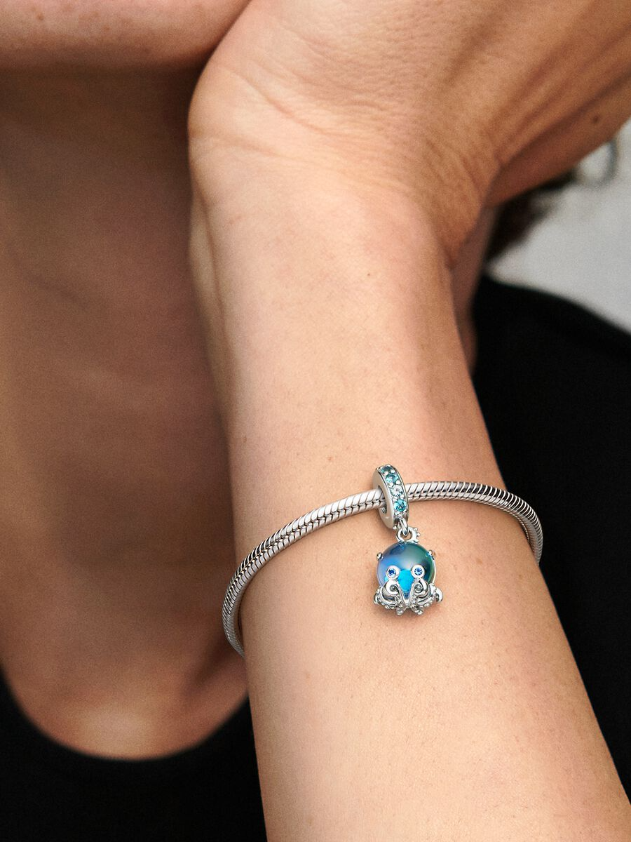 Verken de wonderlijke wereld van de diepblauwe zee en draag deze schattige octopusbedel aan je Pandora Moments-sieraden. Deze hangende bedel is uitgevoerd in prachtig tweekleurig groen en blauw muranoglas met een golvend opengewerkt patroon op de achterkant van sterlingzilver. De sterlingzilver tentakels zijn gekruld en laten de speelse aard van dit vriendelijke en mysterieuze oceaanwezen zien. Man-made kristallen in drie tinten blauw geven de hanger en de ogen van de octopus wat extra glans.