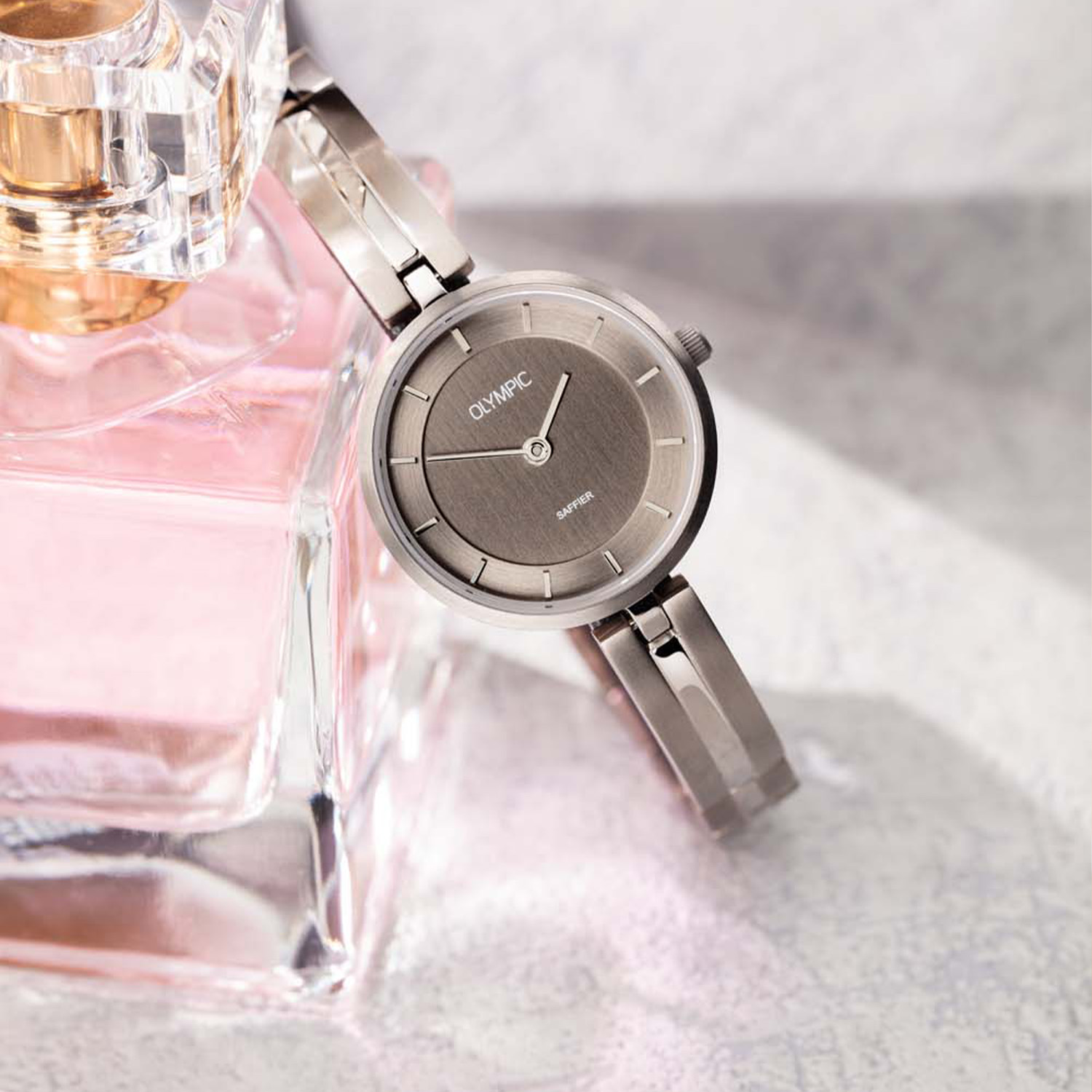 Dit unieke Olympic horloge met artikelnummer: OL1DTT002 is een classic dameshorloge. Het horloge heeft een ronde titanium kast met een grijze bewerkte wijzerplaat met streepjes als uursaanduiding en fijne strakke wijzers. Aan de kast zit een mat glanzende zilverkleurige titanium schakelband met kliksluiting. Het horloge heeft een saffierglas, een doorsnee van 26mm en is 3ATM.