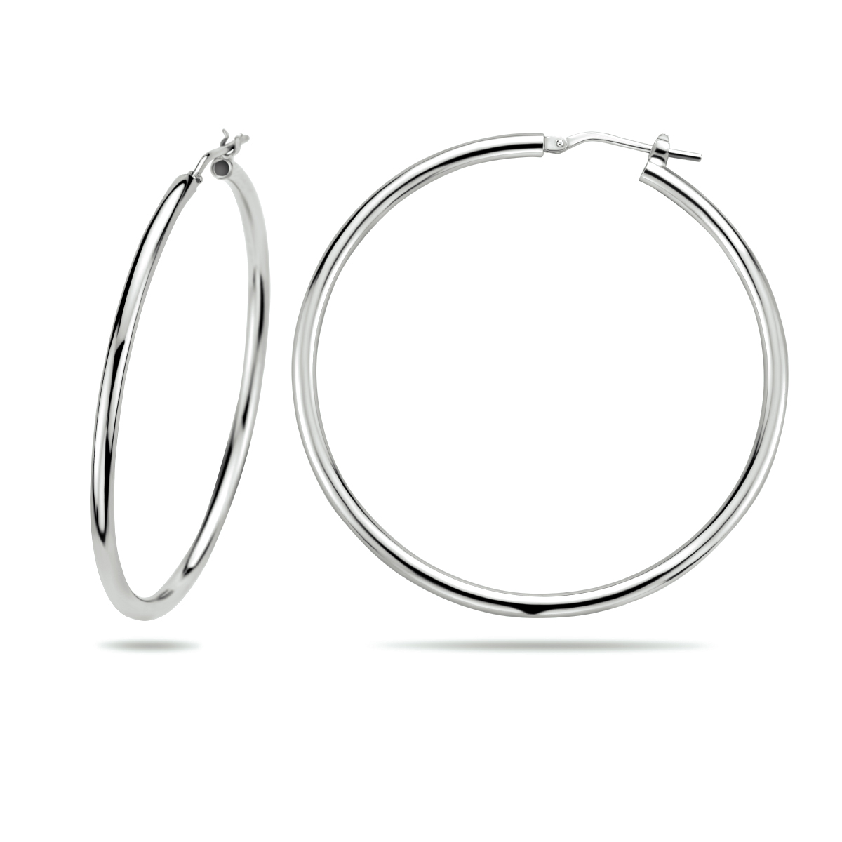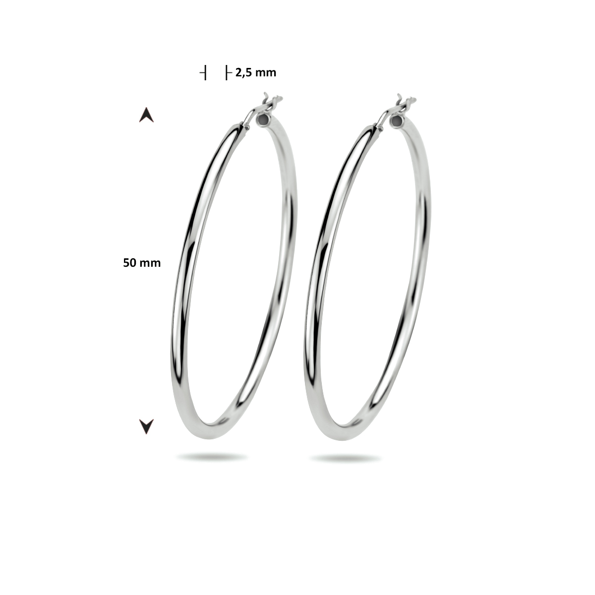 Beschrijving: Gerhodineerd zilveren creolen met een ronde buis en een hefboom-sluiting.