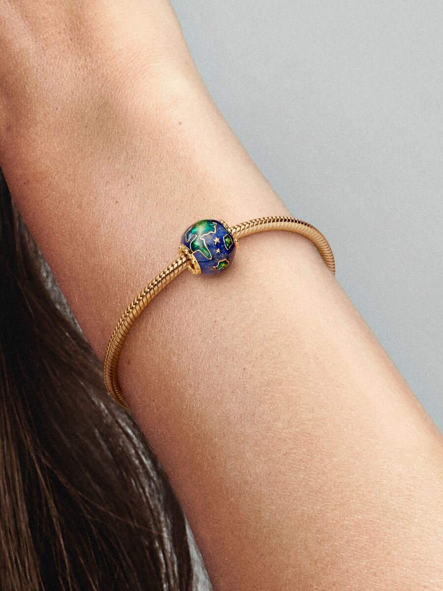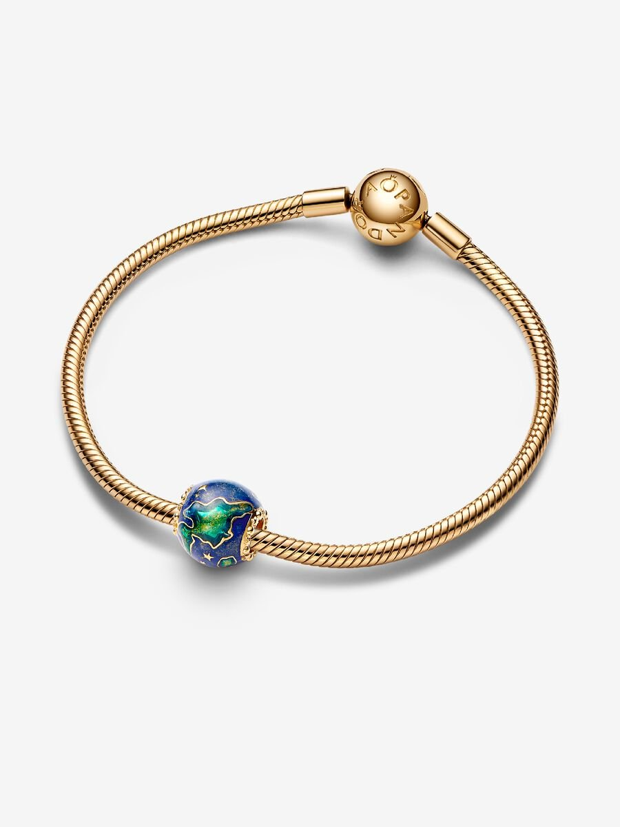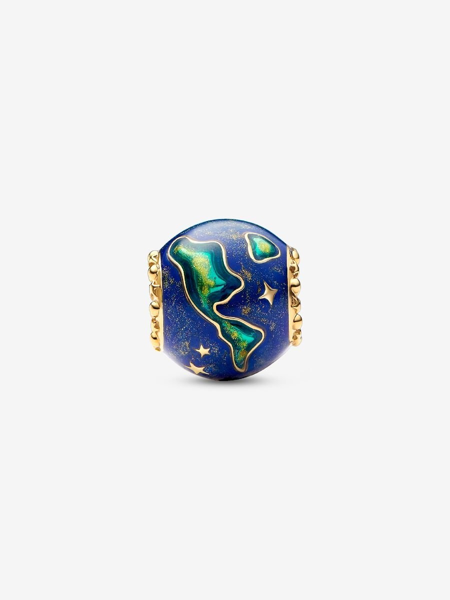 Vier de schoonheid van de planeet die we ons thuis noemen met de Planeet Aarde Bedel. Deze bolvormige bedel heeft een warme vergulde afwerking en met de hand aangebracht email in diepblauwe, groene en glinsterende verguld tinten, die een magisch beeld geven van de planeet Aarde bij nacht. Elk continent is omlijnd in metaal en de bedel is gedetailleerd met verhoogde asymmetrische sterren om de hemelse schoonheid van de aarde van bovenaf gezien te benadrukken. Een rij verhoogde microparels en sterren vormt een rand rond elke kant van de opening van de bedel. Voeg het toe aan je sieraden voor een kosmisch tintje.