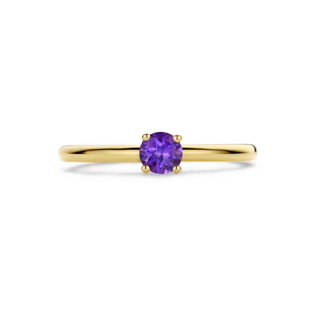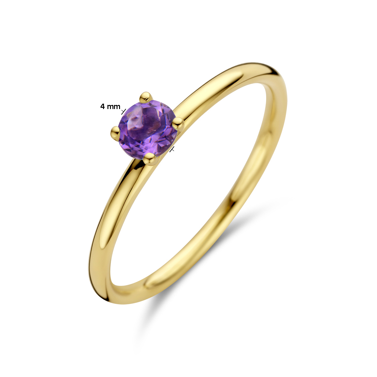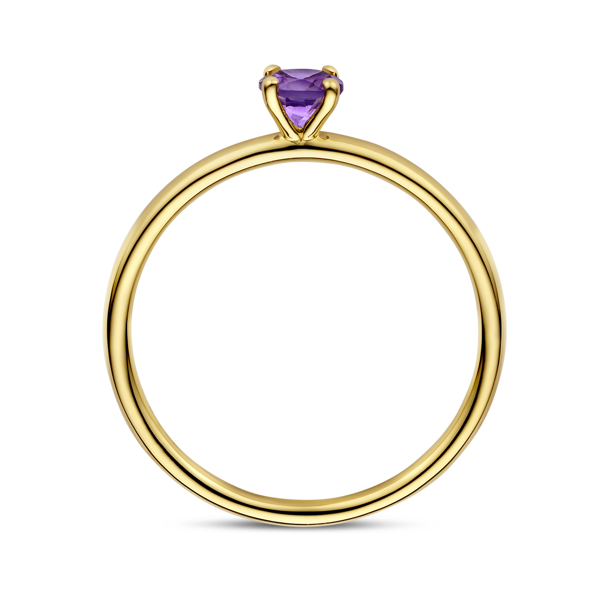 14k Geelgouden ring uitgevoerd met amethist. De ring heeft een breedte van 4mm.