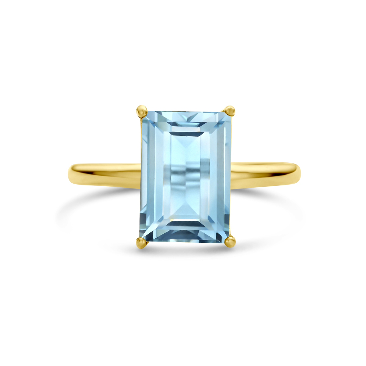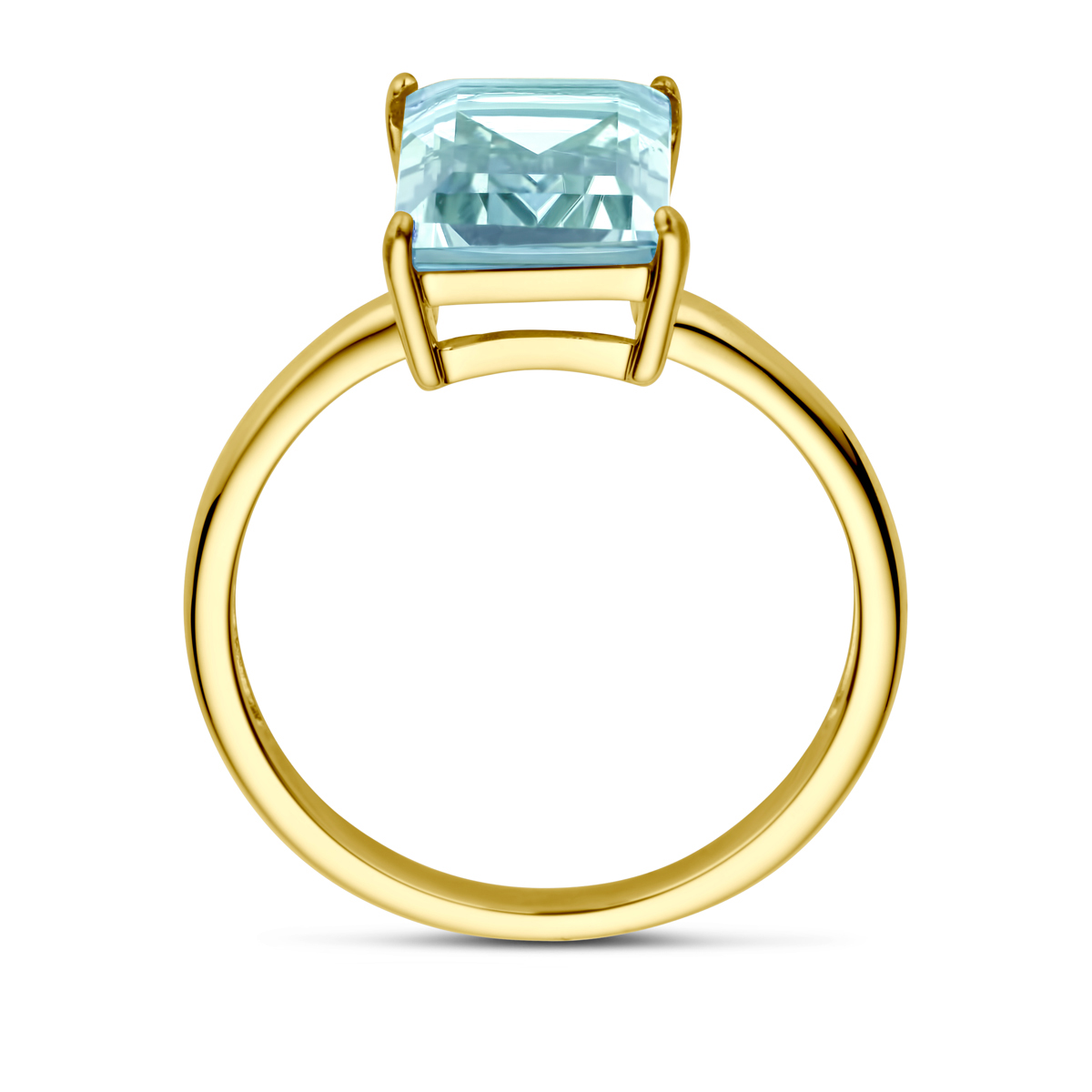 14k Geelgouden ring uitgevoerd met blauw topaas. De ring heeft een breedte van 12mm.