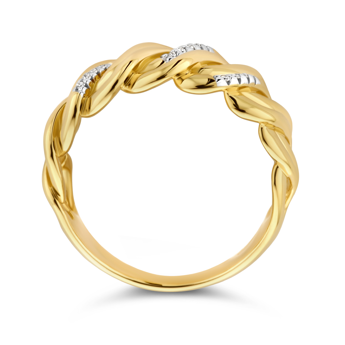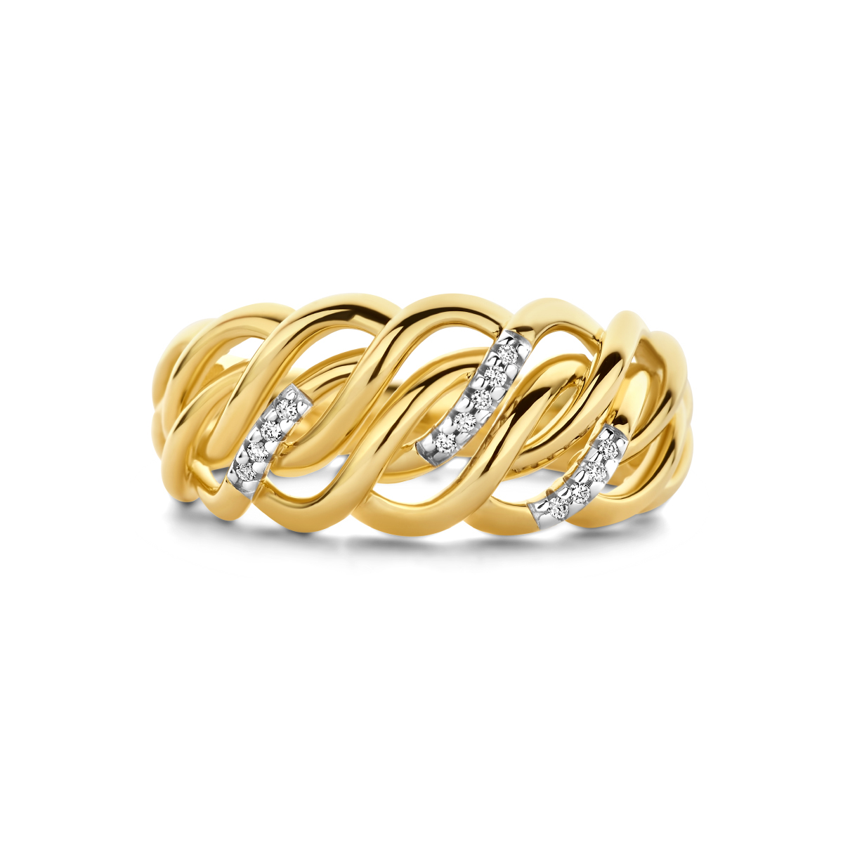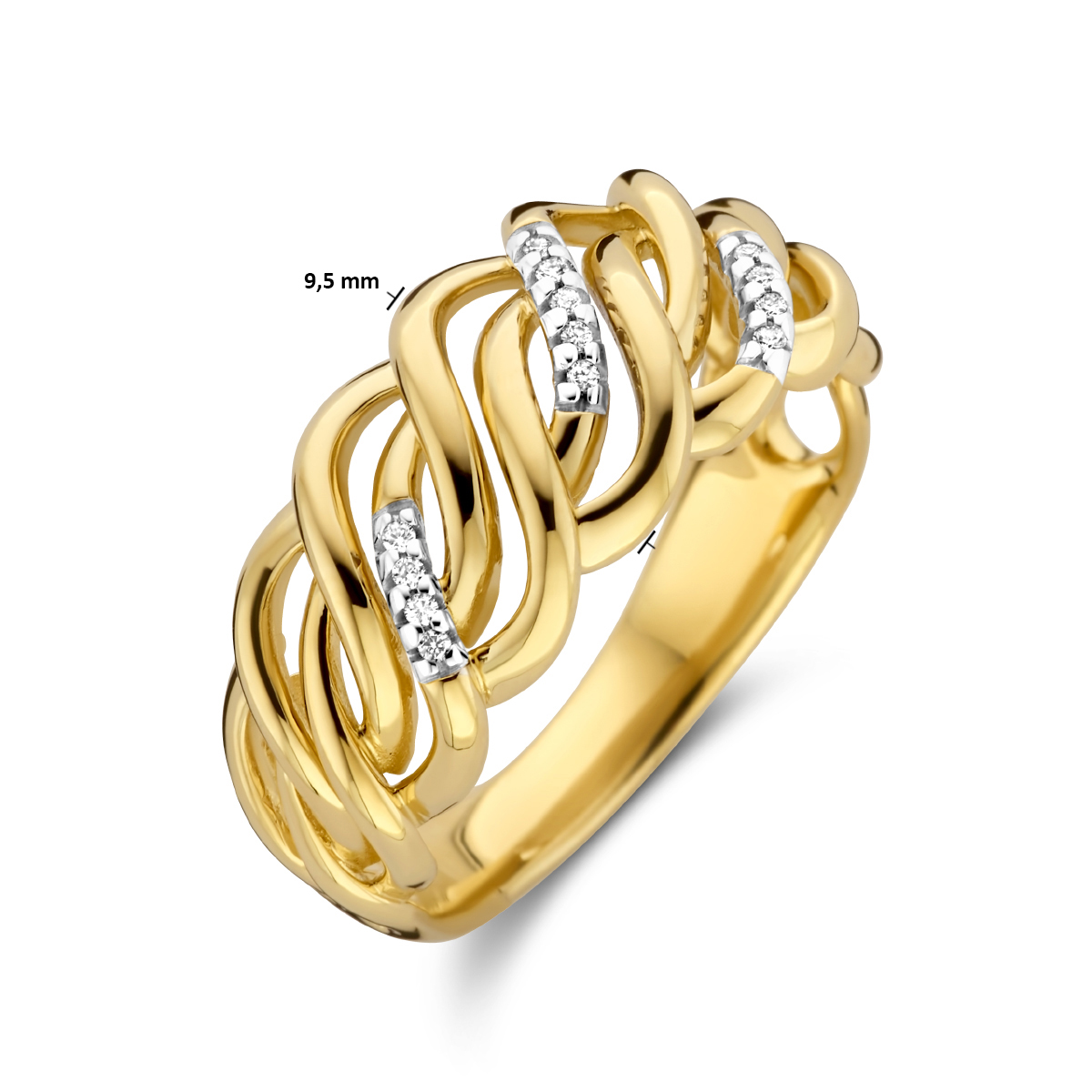 14k Geelgouden ring uitgevoerd met schitterende diamant rijen. De ring heeft een breedte van 9.5mm.
