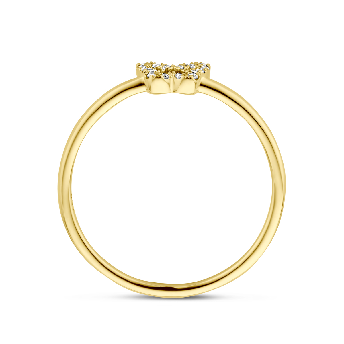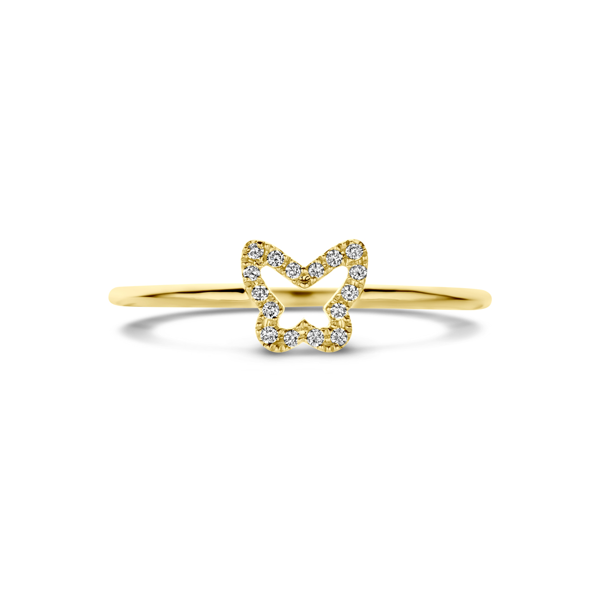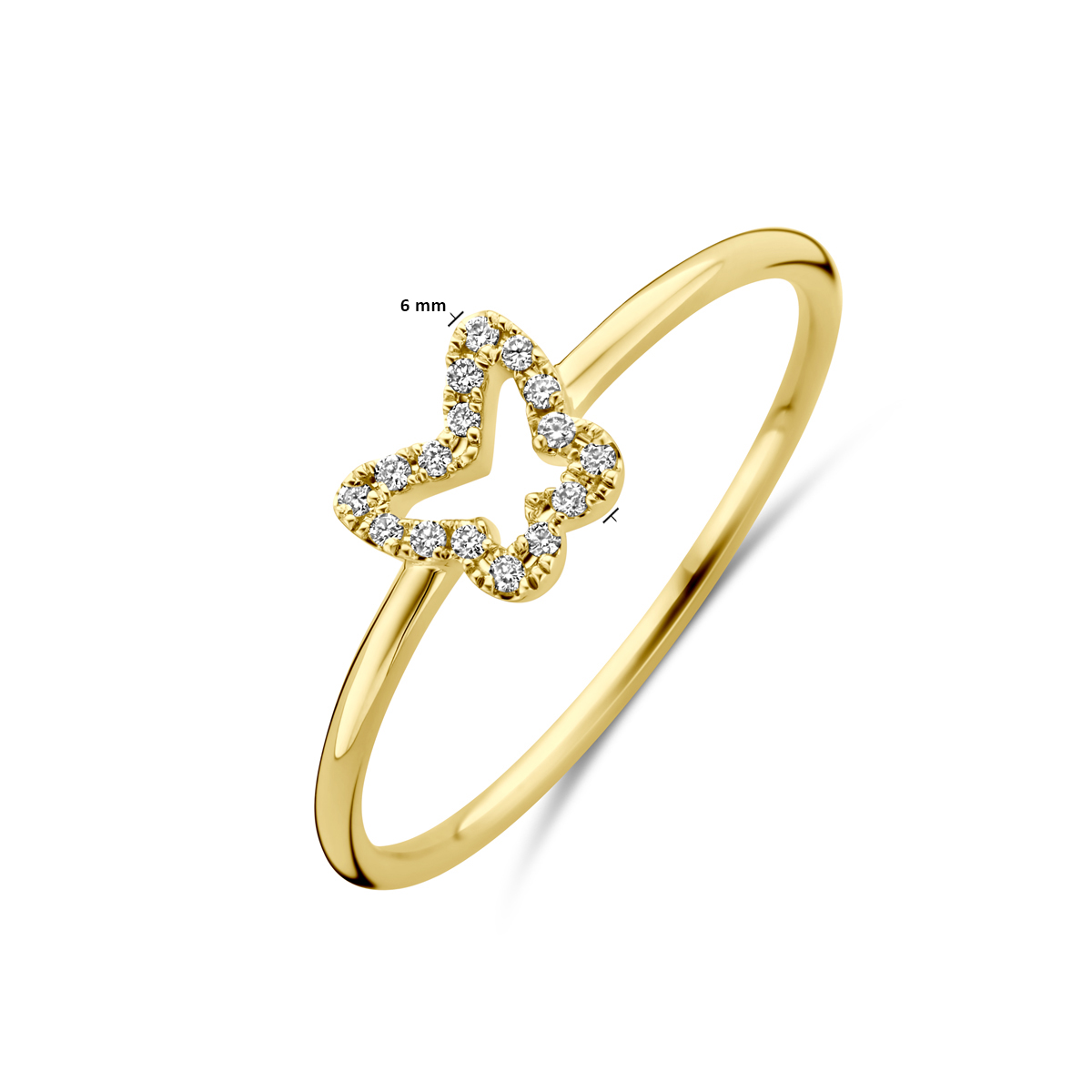 14k Geelgouden ring uitgevoerd met een vlinder van diamant. De ring heeft een breedte 6mm. Het diamantgewicht is 0.05ct.