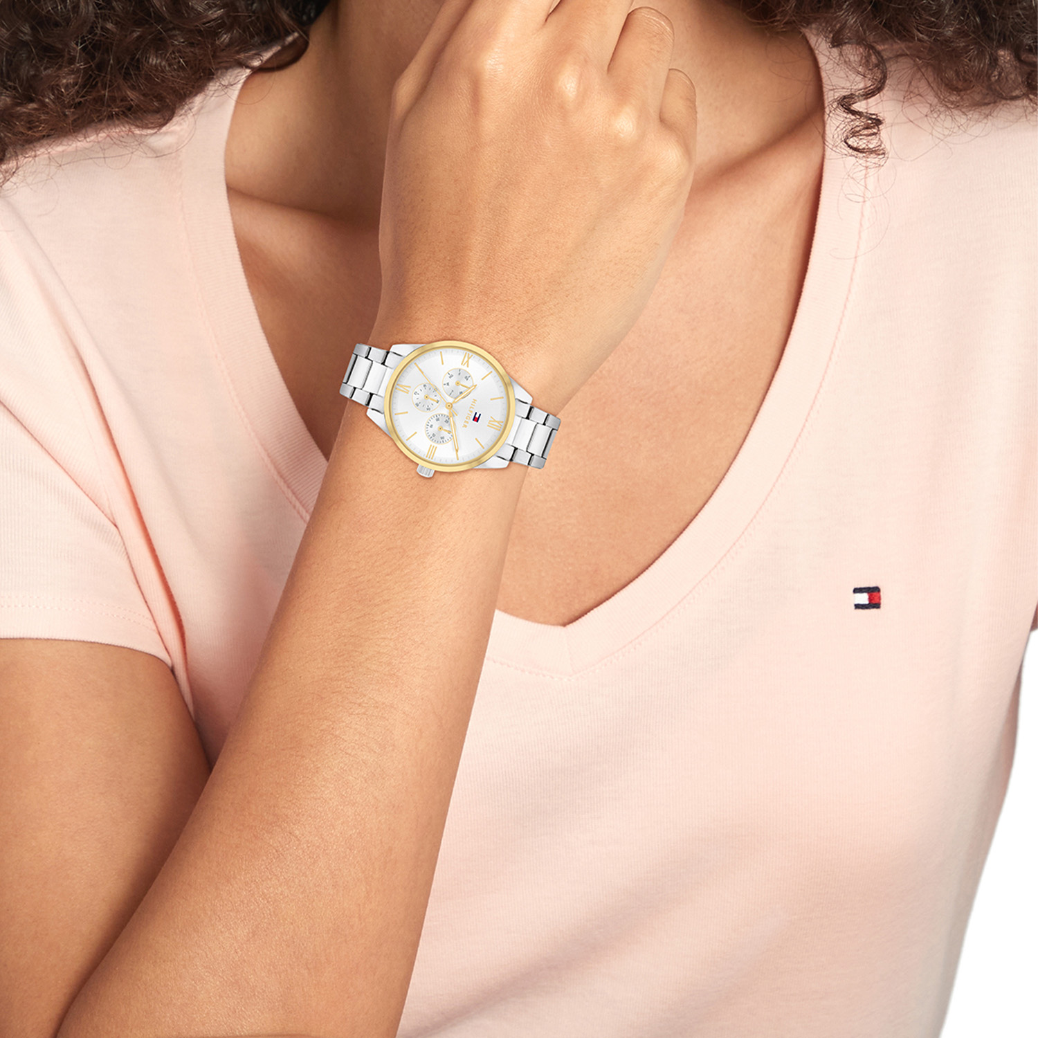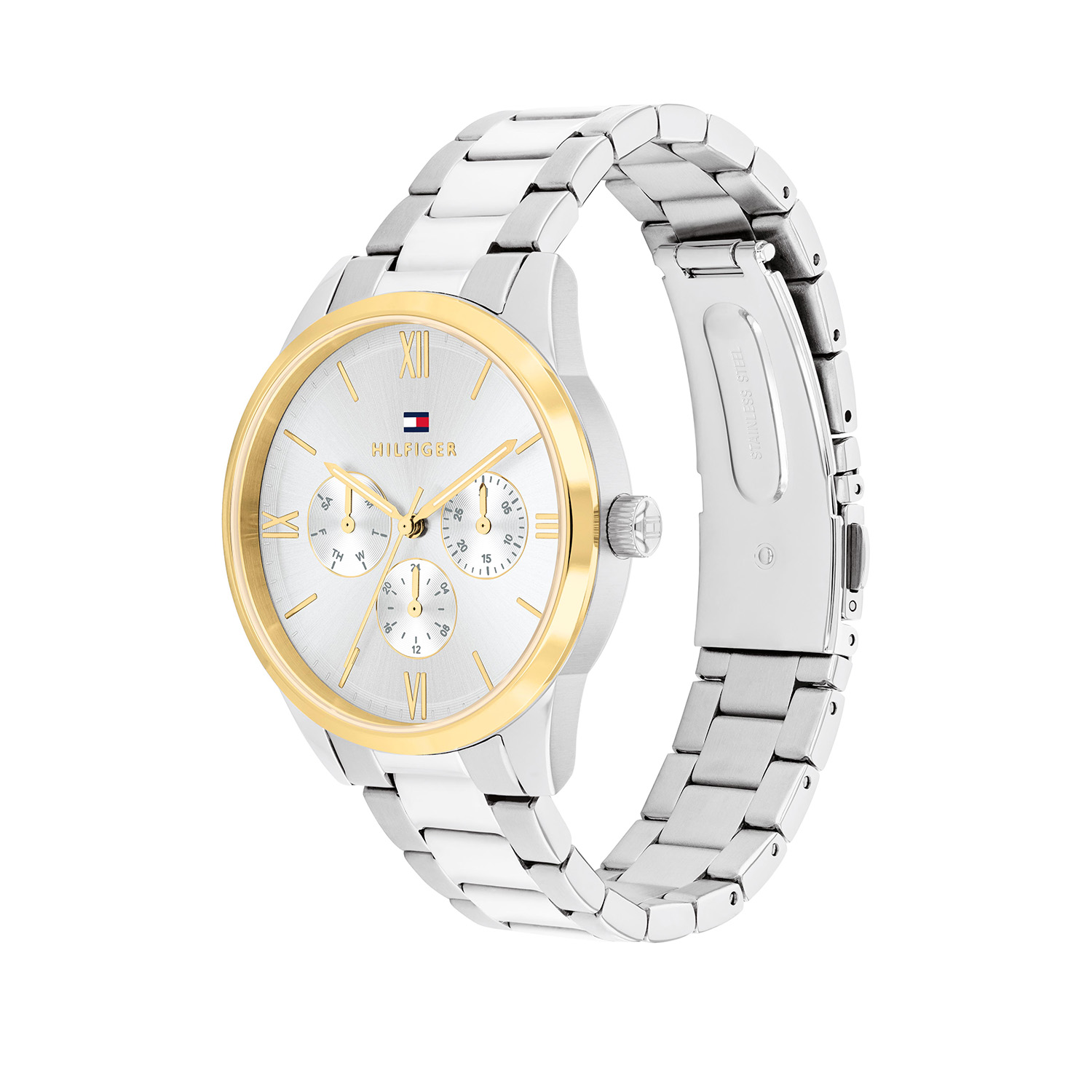 Dit specifieke horloge van Tommy Hilfiger uit de Camille serie met artikelnr: TH1782744 is een luxe horloge die zeker niet in je collectie mag ontbreken. Het stalen dameshorloge heeft een ronde zilverkleurige kast met een goudkleurige gladde bezel. Het horloge heeft een zilverwitte wijzerplaat met uren die worden weergegeven met goudkleurige romeinse cijfers. Verder is het horloge multifunctioneel, heeft het dag,-datum en 24-uursaanduiding. Het horloge heeft een zilverkleurige verstelbare schakelband, een mineraalglas, een doorsnee van 38mm en is 3ATM.