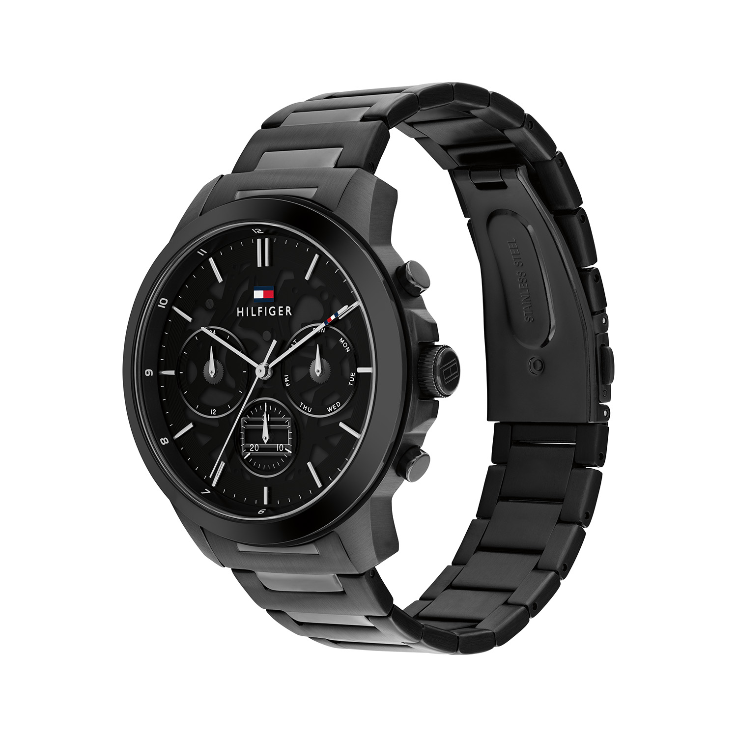 Dit specifieke horloge van Tommy Hilfiger uit de Henry serie met artikelnr: TH1710685 is een stoer herenhorloge die niet in je collectie mag ontbreken. Het herenhorloge heeft een ronde zwarte stalen kast met een zwarte opengewerkte wijzerplaat met een dag, datum en 24-uursaanduiding. Aan de kast zit een zwarte stalen schakelband met een vouwsluiting. Het horloge heeft een mineraalglas, een afmeting van 43mm en is 5ATM.