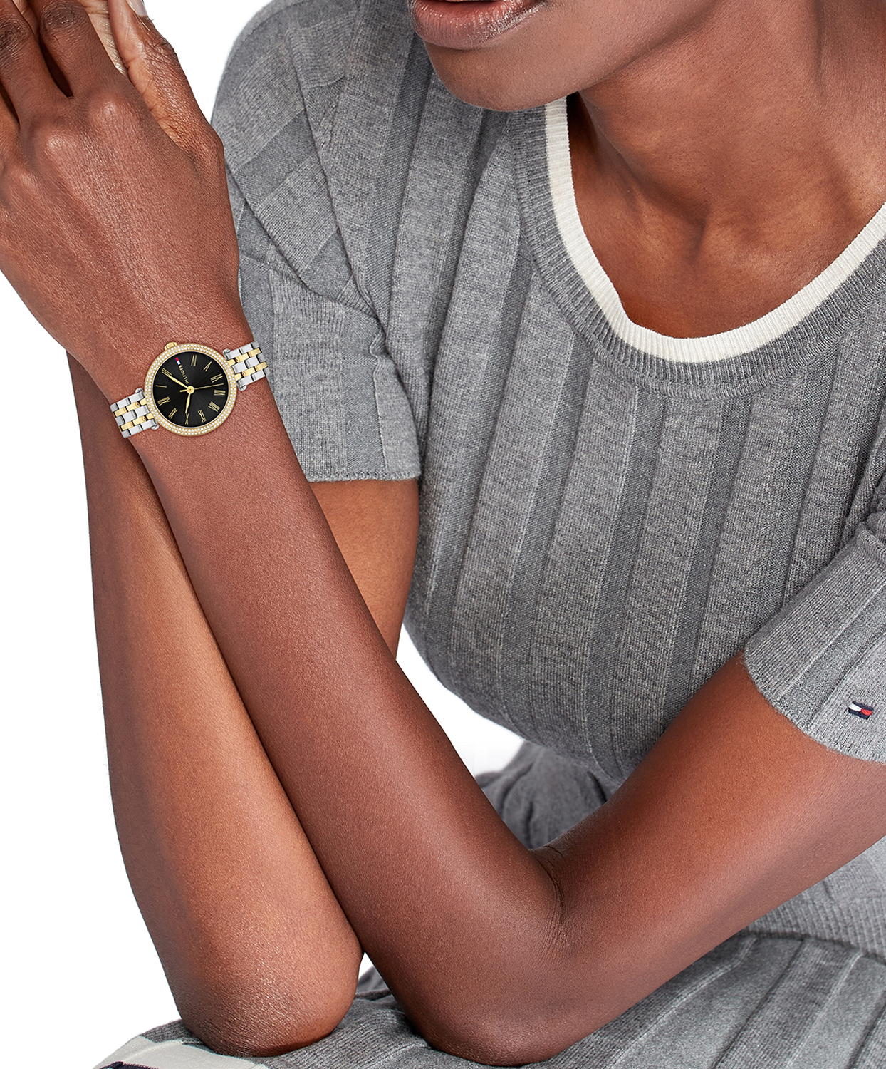 Dit specifieke horloge van Tommy Hilfiger uit de Nathalie serie met artikelnr: TH1782720 is een luxe dameshorloge die niet in je collectie mag ontbreken. Het stalen dameshorloge heeft een ronde zilverkleurige kast met een bezel met 2 rijen kristallen en een zwarte sunray wijzerplaat met romeinse cijfers en hele sierlijke wijzers. Aan de kast zit een fijne bicolor schakelband met een speciale aanzet. Het horloge heeft een mineraalglas, een doorsnee van 34mm en is 3ATM.