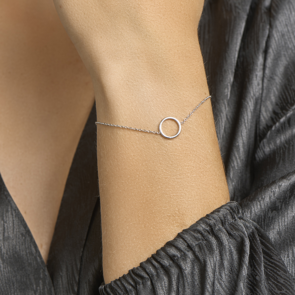 Trendy gerhodineerd 925 zilveren 1.3mm anker armband met een lengte van 16cm en een extensie van 3cm uitgevoerd met een open cirkel van 11mm. De armband is te combineren met bijpassende sieraden uit onze collectie.